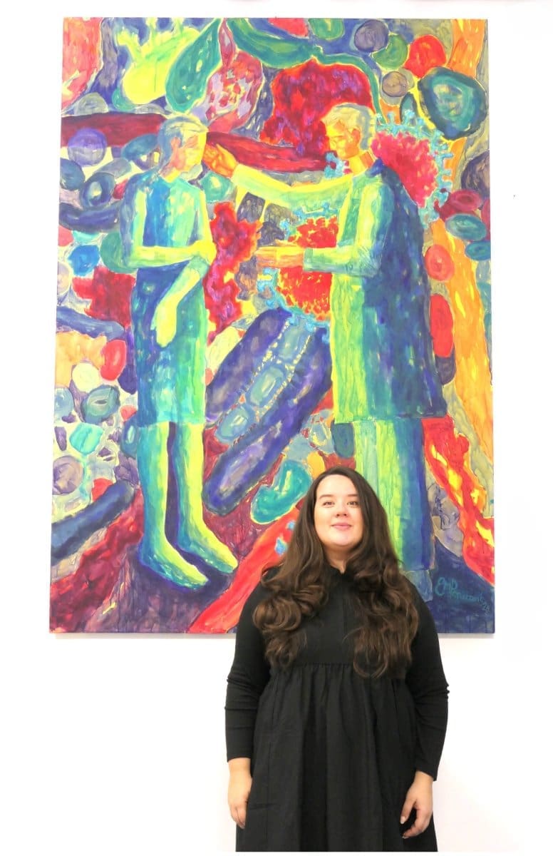„U ovo blagdansko vrijeme iščekivanja Božića, poželjela sam darovati svoju sliku onima koji nam daruju svoje znanje, vrijeme i brigu – liječnicima Klinike za infektologiju KBC-a Split. Prikaz je to liječnika koji brine o pacijentu, u kompoziciji s virusima, bakterijama i drugim mikroorganizmima. Slika je dobila i vedar naziv koji nosi najljepšu iskrenu želju, a koja je ujedno i poznati dalmatinski pozdrav 'Zdravi bili'. Nadam se da će ovaj dar biti poticaj i drugim umjetnicima da svojim doprinosom, kreativnim i likovnim, uljepšaju bolničke prostore. Neka moja slika, svojim žarkim koloritom, doista svakom poruči 'Zdravi i veseli bili'“, naglasila je umjetnica.