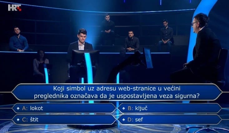 Zbog dvojbe oko simbola koji uz adresu internetske stranice u većini preglednika označava sigurno uspostavljenu vezu, student pete godine elektrotehnike na FER-u uzeo je joker pola-pola na pitanju za 8000 kuna. Tu su mu ostali upravo oni odgovori oko kojih se dvoumio - lokot i štit. Ipak, odlučio se za lokot i nastavio s igrom.