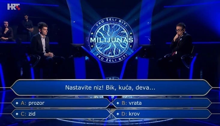 "Bik, kuća, deva...", glasili su pojmovi na koje je Dorian trebao nastaviti niz. Ponuđeni odgovori bili su - prozor, vrata, zid i krov. On je ipak odustao i kući odnio 125.000 kuna.