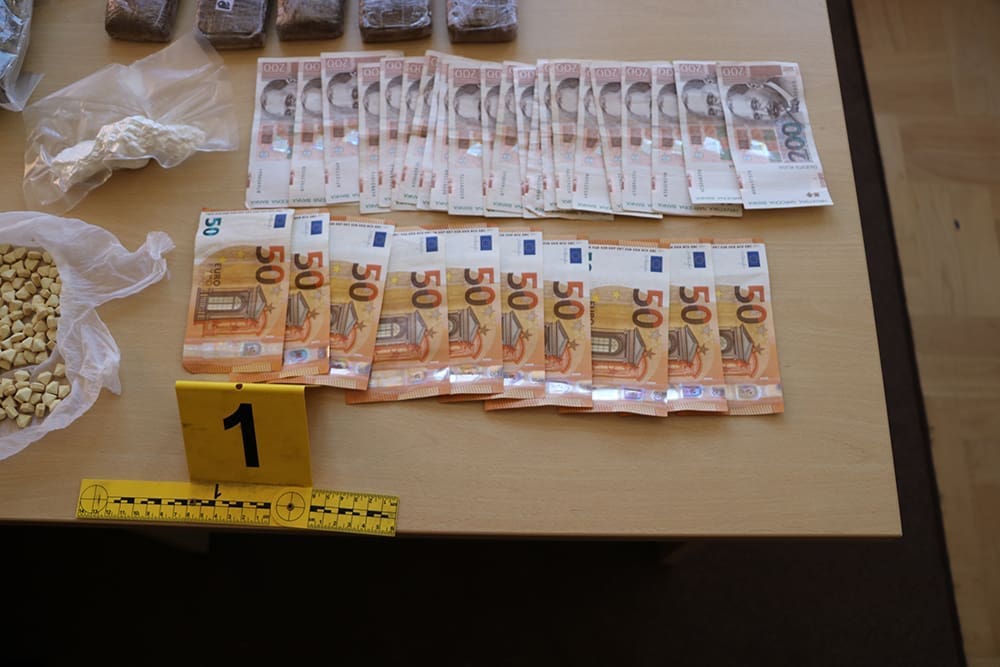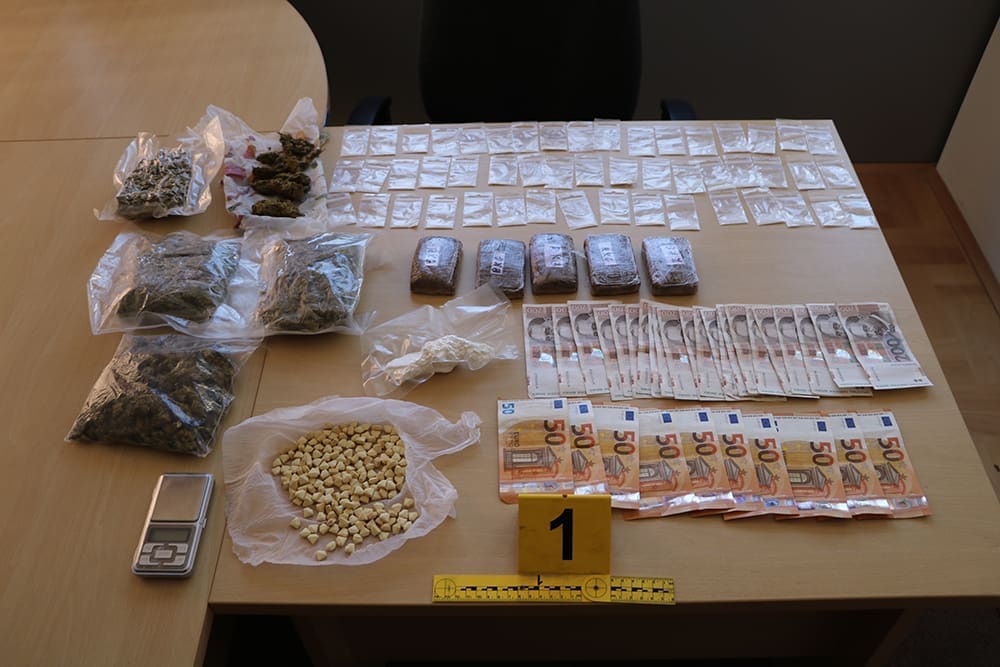 Temeljem naloga Županijskog suda u Šibeniku je 26. kolovoza, uz pomoć službenog psa za detekciju droga Aria koji je reagirao na prisutnost droga u vozilu i apartmanu, izvršena pretraga vozila, kao i pretraga apartmana u Murteru kojim se koriste 30-godišnjak i 25-godišnjakinja. Tom prilikom su spomenuti 30-godišnjak i 25-godišnjakinja policijskim službenicima izručili 572 tablete i osam polovina tableta amfetamina tzv. ecstasy, 62,4 grama droge MDMA, 484,8 grama marihuane, 93,6 grama ketamina, 98,1 gram kokaina, 487,5 grama hašiša i 31,2 grama droge amfetamin tzv. speed, kao i digitalnu vagu za precizno mjerenje te ukupno 49 170 kuna, 600 eura i 20 funti, a što je sve od njih oduzeto.