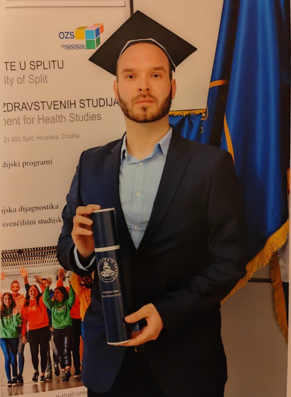 U Splitu je završio preddiplomski sveučilišni studij radiološke tehnologije na današnjem Fakultetu zdravstvenih znanosti. Nakon završenog preddiplomskog studija je stekao zvanje sveučilišnog prvostupnika radiološke tehnologije. Pripravnički staž je pohađao u KBC Sestre Milosrdnice, a sada je na završnoj godini diplomskog studija radiološke tehnologije na Fakultetu zdravstvenih znanosti.