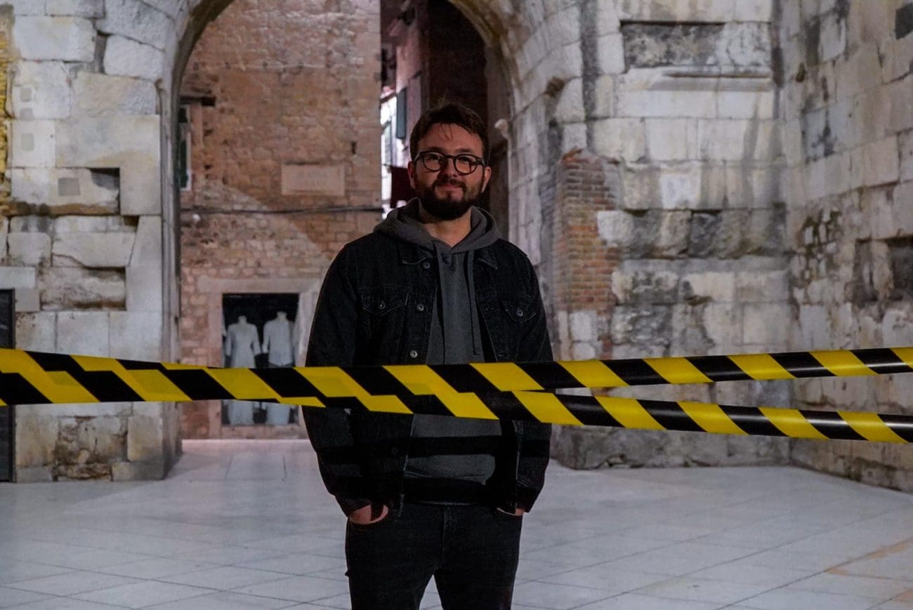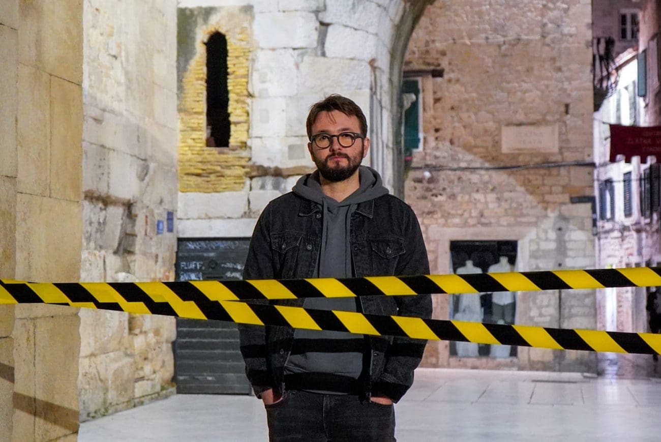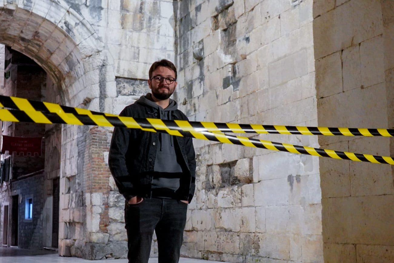 Fotografiranje nakon intervjua Matije Rubića za našu rubriku „Iza kulisa“ bilo je jedno od neobičnijih novinarskih iskustava. Mjesto radnje – Zlatna vrata. Vrijeme radnje – kasni noćni sati. U Splitu još pokoji turist, neki od njih dobrano pod gasom. Fotografkinja Mia Milković s improviziranom crime scene trakom koja zbilja ide uz Rubićeve romane – prvijenac „Obojena svjetlost“ u kojemu njegov junak Roko Miletić istražuje slučaj djevojke ubijene na splitskoj plaži, a potom i „Zlatna vrata“, nastavak serijala o mladom istražitelju koji je na prekrasnom dijelu Dioklecijanove palače zatekao zavezane dječje tenisice i jeziv krvavi natpis nakon kojeg je sigurno samo jedno – Split više nije siguran grad, a mete su oni najranjiviji – djeca.
