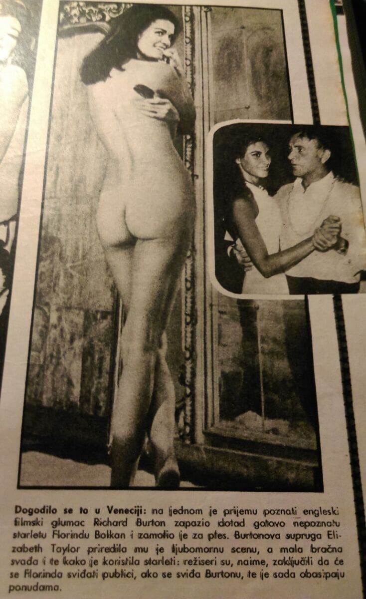 Čitam u tom Plavcu „skandaloznu“ vijest, da je poznati britanski glumac Richard Burton zamolio za ples neku nepoznatu djevojku, pa je njegova supruga Elizabeth Taylor pošizila. Kako neće kad je ta mlada i nepoznata djevojka imala sve… S prednje i stražnje strane. Na tragu te vijesti, filmski producenti su u toj djevojci koja se zvala Florinda Bolkan, vidjeli mogućnost da se ostvari i u nekim filmskim projektima. Dobro su rezonirali; kad se sviđa Burtonu, vjerojatno će se svidjeti i publici!