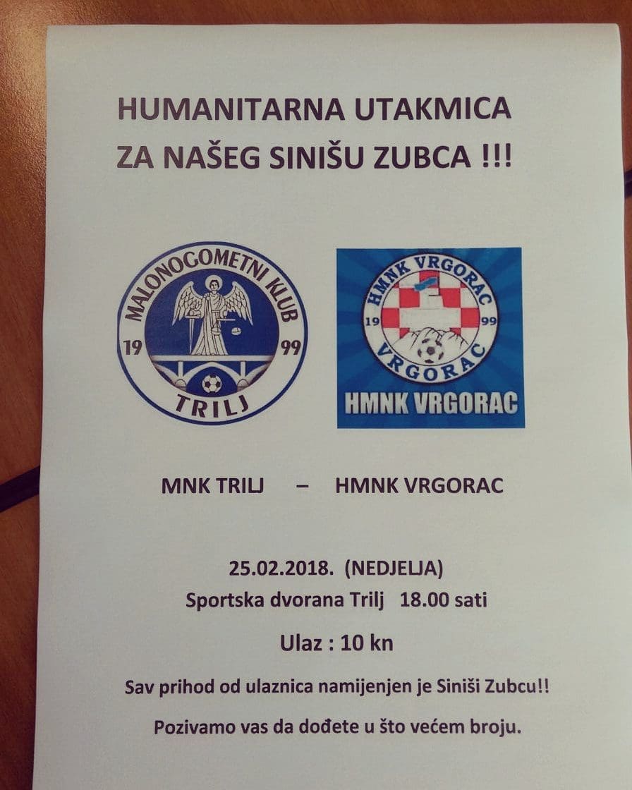 Radi se o utakmici koja će se u nedjelju, 25. veljače, s početkom u 18 sati, odigrati u Sportskoj dvorani Trilj. Snage će odmjeriti MNK Trilj i HMNK Vrgorac. Sav prihod od ulaznica namijenjen je Siniši Zubcu, a ulaznica košta 10 kuna.