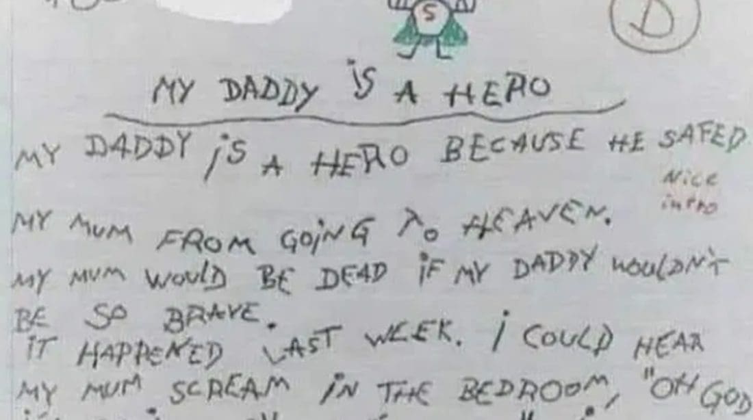 'Moj tata je heroj jer je spasio moju mamu od odlaska na nebo. Moja mama bi bila mrtva da moj tata nije bio tako hrabar. To se dogodilo prošli tjedan. Mogao sam čuti mamu kako vrišti u spavaćoj sobi. ‘O Bože, dolazim, dolazim.’ Bio sam uplašen jer nisam htio da mi mama umre. Otrčao sam u njihovu spavaću sobu. Noge su joj bile u zraku. Bog ju je pokušao povući, ali tata je bio na njoj i držao je. Toliko puta ju je gurnuo dok Bog nije pustio', napisao je u svojoj zadaći.