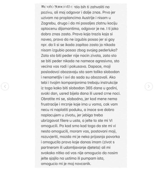 "Ne možete očekivati prihvaćanje na taj način. Dokle god postoji nekolicina na Prideu koja će uništavati ostatak 'normalnih' ja neću prisustvovati toj povorci", dodao je. "Prava koja tražiš, koja si naveo, pravo da ne izgubiš posao jer si gay npr. da li se ikad zapitao zašto ja nikad nisam izgubio posao zbog svojeg pederluka? Zato što biti peder nije način života, zašto što se biti peder nikad ne nameće agresivno, što većina vas radi i pokušava", kaže.