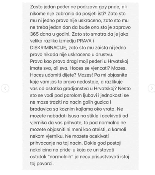 "Prava kao prava, dragi moji pederi u Hrvatskoj, imate sva. Hoćeš se vjenčati? Možeš. Hoćeš udomiti dijete? Možeš. Pa mi objasnite koje vam još to pravo nedostaje, a razlikuje vas od ostatka građanstva u Hrvatskoj? Nešto što se vodi pod parolom ljubavi i jednakosti se ne može tražiti na način golih guzica i bradavica s kožnim kajlama oko vrata. Ne možete nabadati Isusa na štikle i očekivati od vjernika da vas prihvate, to pod normalno ne možete objasniti ni meni kao ateistu, a kamoli nekom vjerniku", napisao je Vanja.