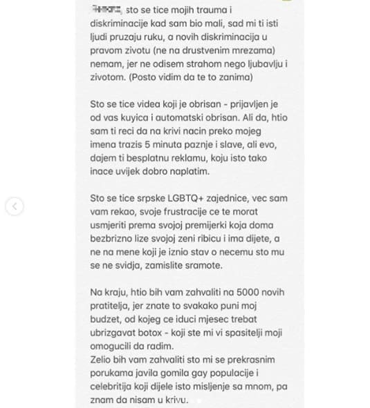 "Znao sam da će video izazvati mnoge burne reakcije među pripadnicima LGBT populacije. Kao član LGBT populacije, odnosno nisam član, samo sam jedna obična pederčina, i to ne svojim odabirom, imam potpuno pravo reći da je Pride za mene bespotrebna stvar i nitko me ne može uvjeriti da je gola guzica i lizanje bradavica na Prideu nešto što se treba prihvatiti pod normalno. Ne, nikad se to ne treba prihvatiti pod normalno jer nisu pederi oni koji ližu bradavice na Prideu. A što se tiče diskriminacije LGBT populacije uzmite u obzir da svaki dan diskriminaciju proživljava i ono autistično dijete, dijete s posebnim potrebama, debelo dijete i dijete koje nosi naočale pa mi recite da li jednog dana ti ljudi trebaju imati Pride za autistične? Ne", odgovorio je onima koji su mu poručili da su "svugdje po svijetu ljudima prava ukinuta zbog seksualnosti".