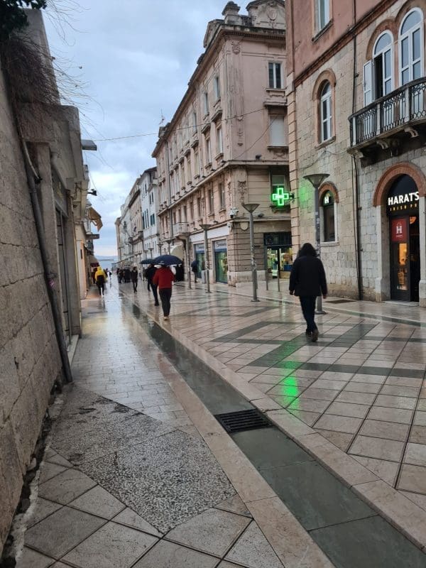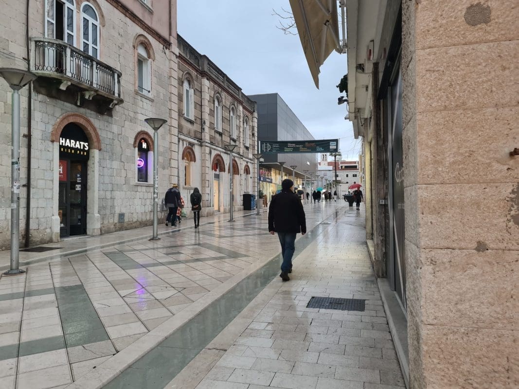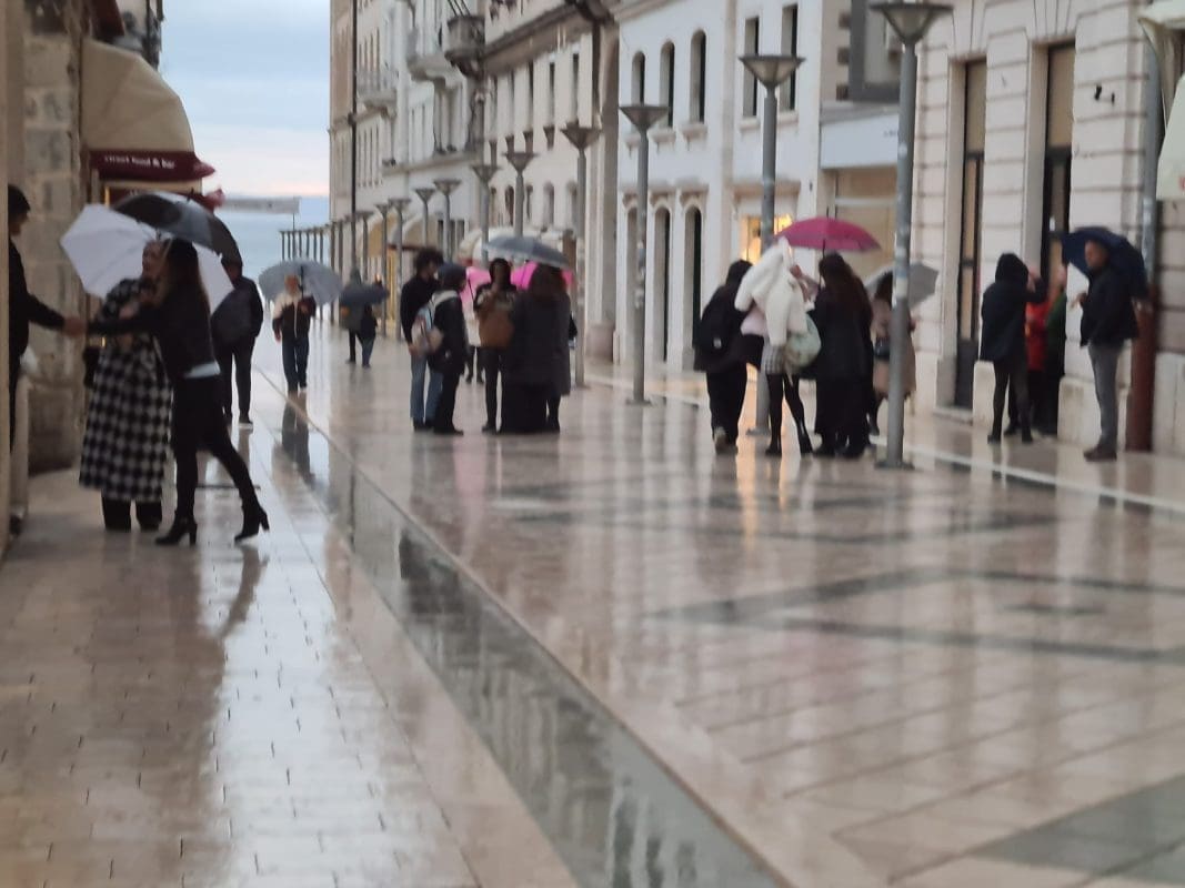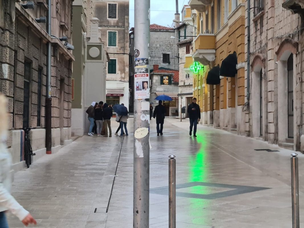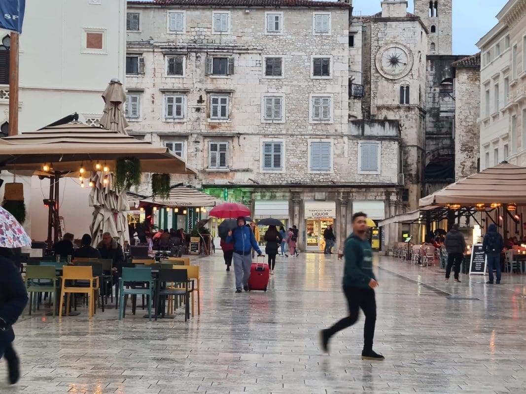 Iako je u petak uporno padala, kiša nije uspjela spriječiti Splićane da se prošetaju centrom grada. Većiom su to bili znatiželjni turisti u obilasku, ali moglo se naići i na poneko domaće lice.
