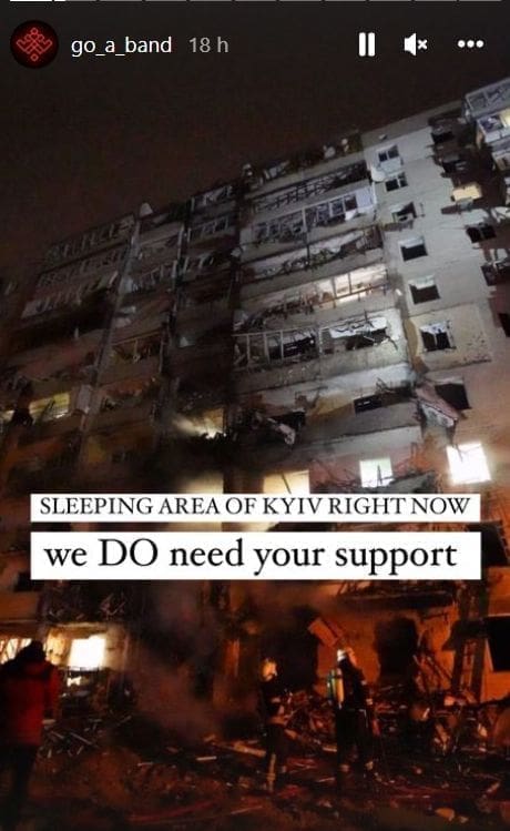 Prošle godine, folktronički sastav Go_A, predstavljao je Ukrajinu na Eurosongu gdje su završili na petom mjestu sa svojom verzijom folklor pjesme 'Shum'. Zbog neizvjesne situacije članovi benda preko svog Instagrama objavljuju potresne prizore i apele za pomoć.