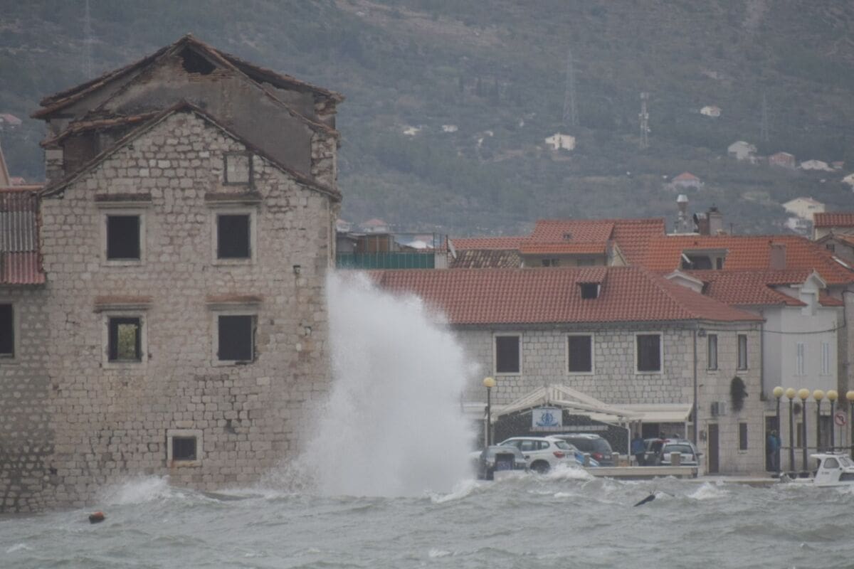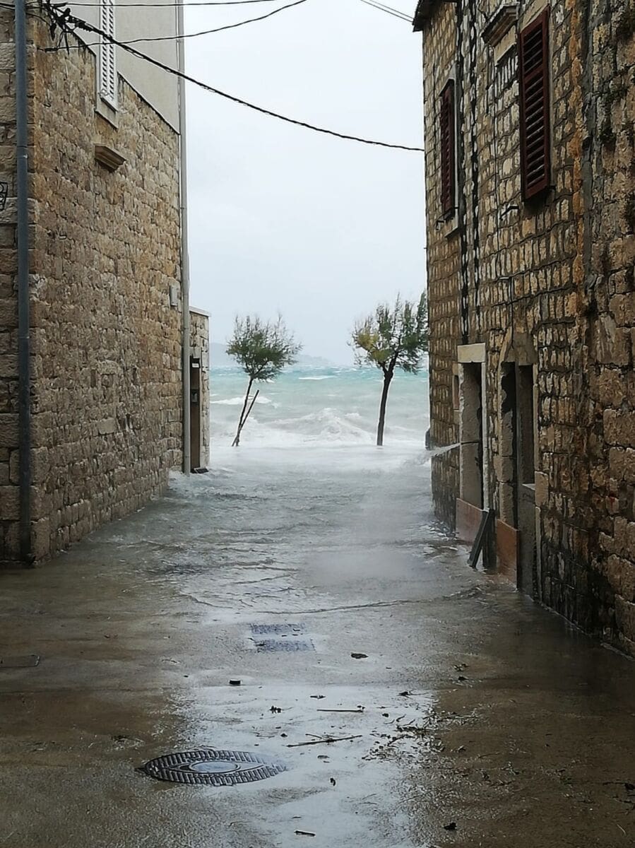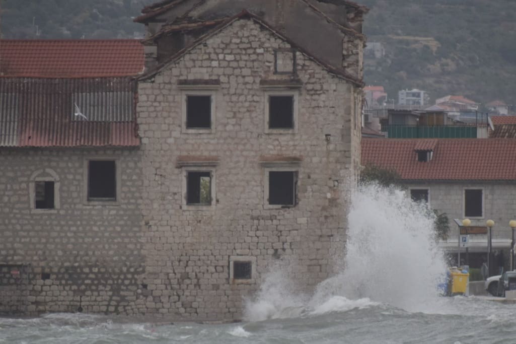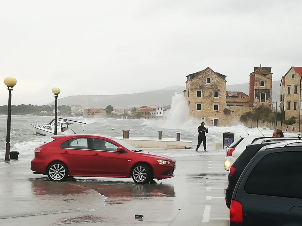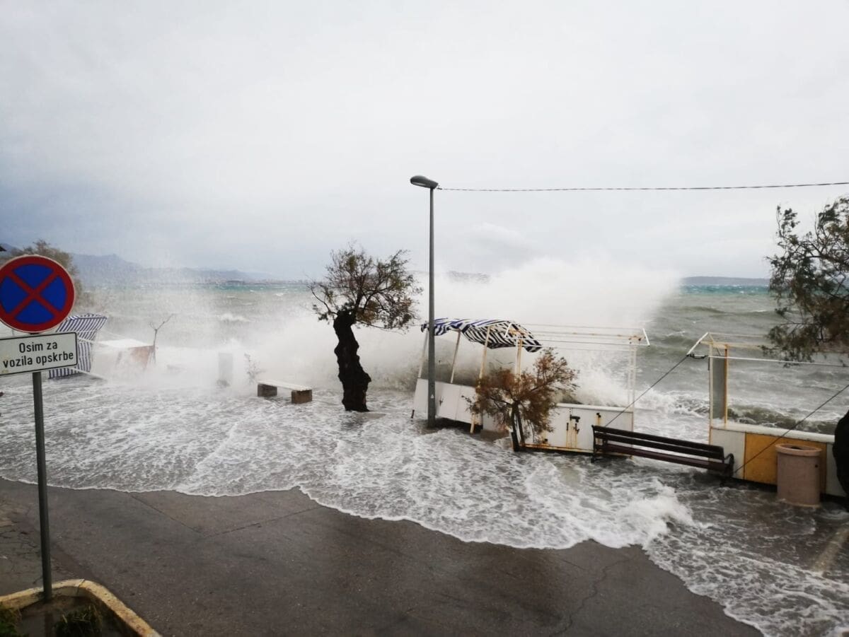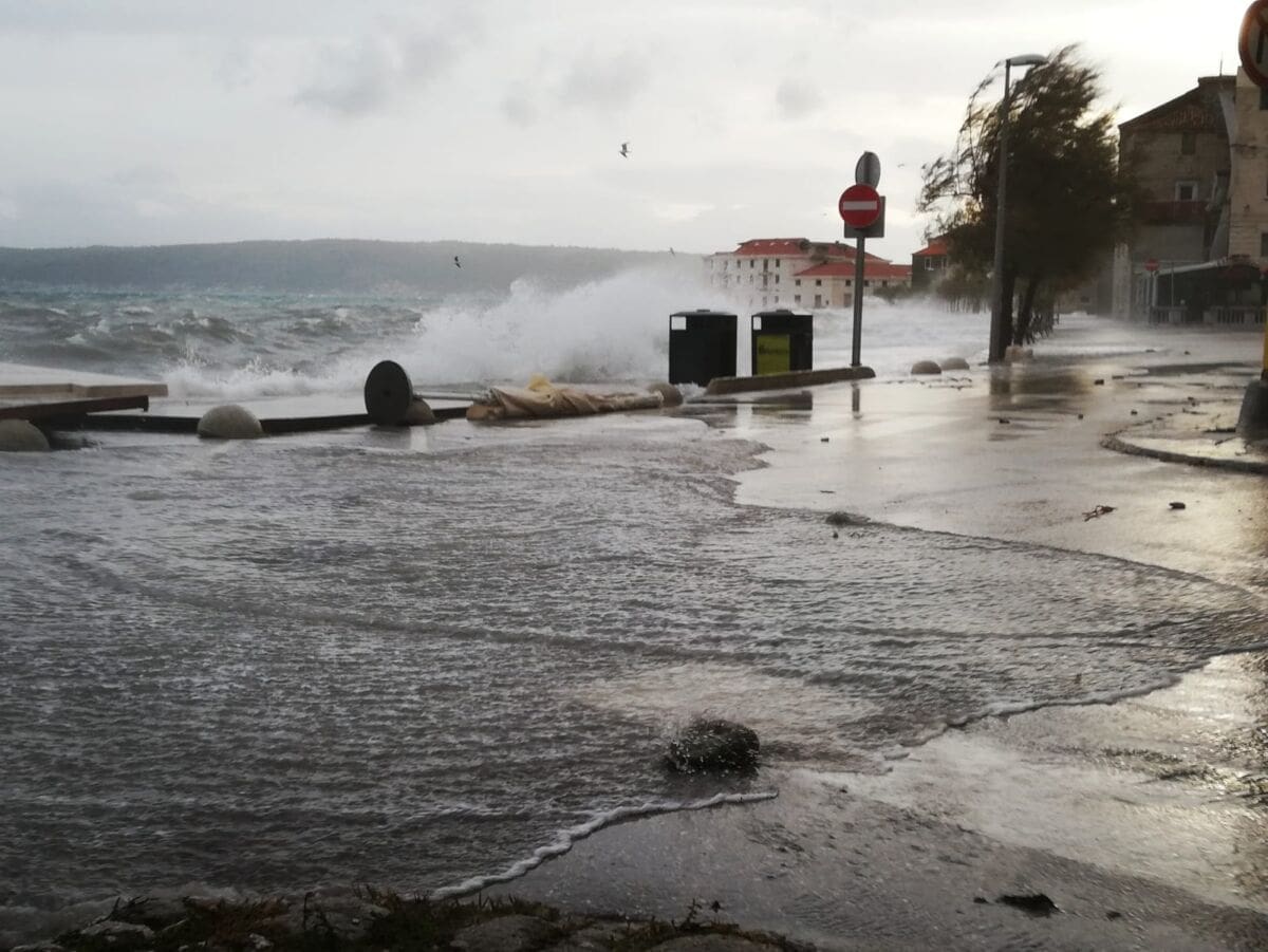 Najveća plima ove godine poplavila je kaštelansku rivu, a valovi su ponegdje donosili more sve do kućnih pragova. Plima je na rivu i na ceste uz more nasula žalo i kamenje.