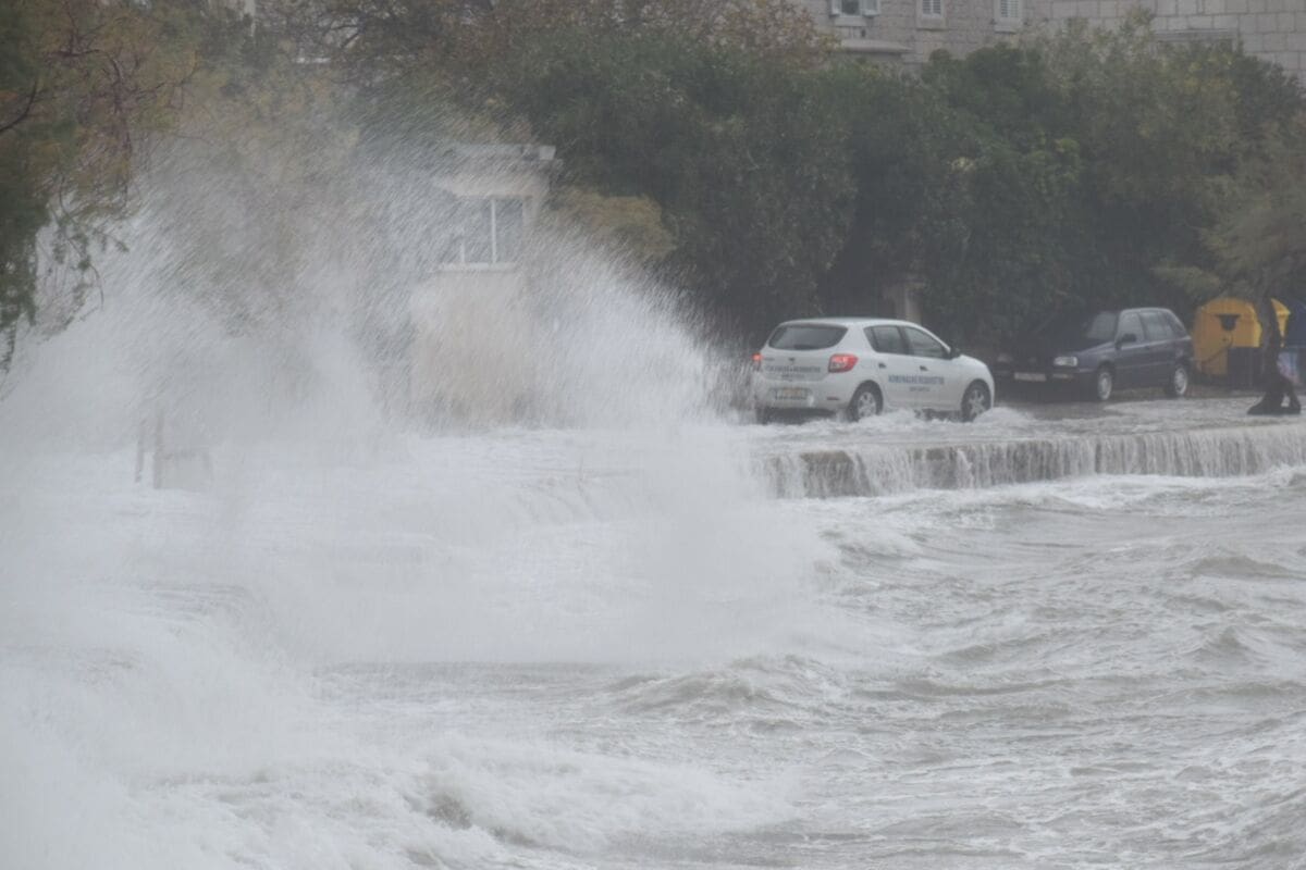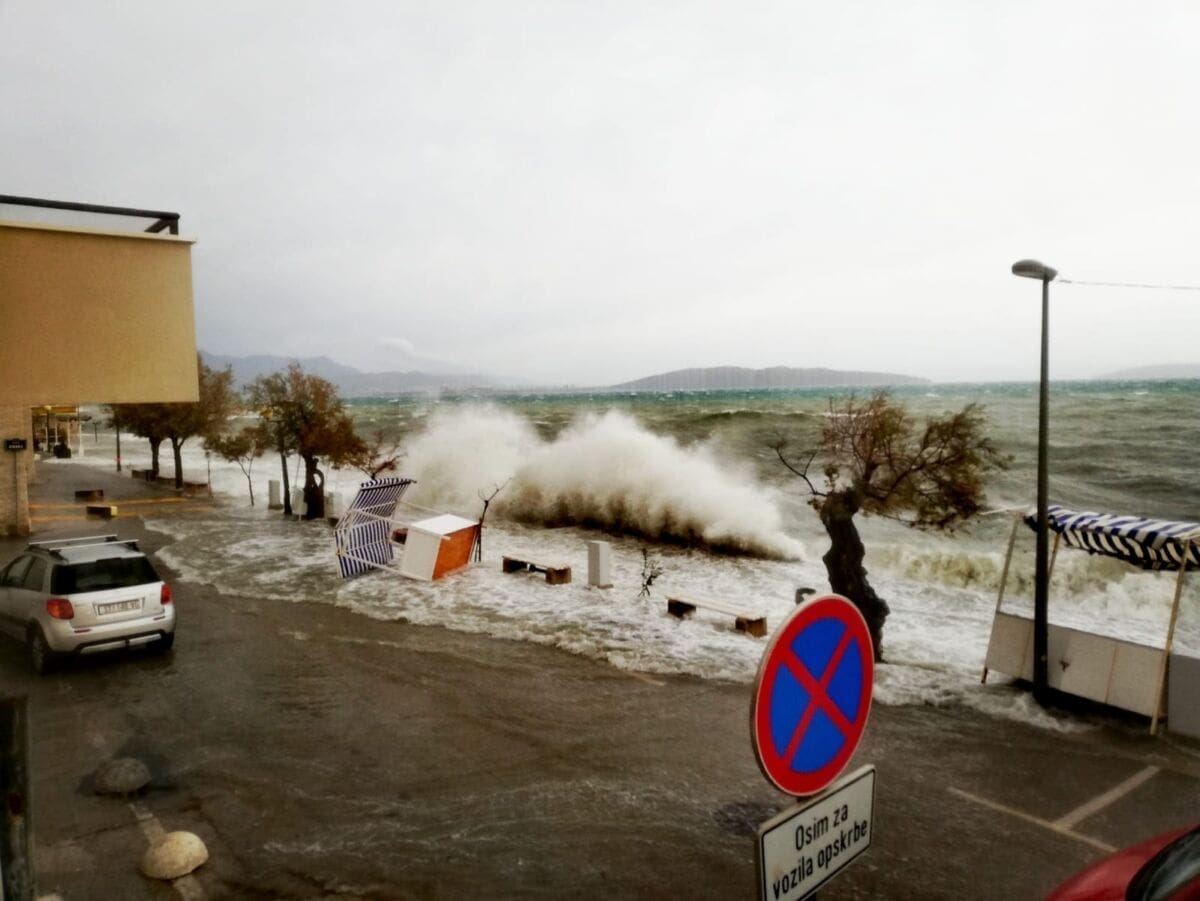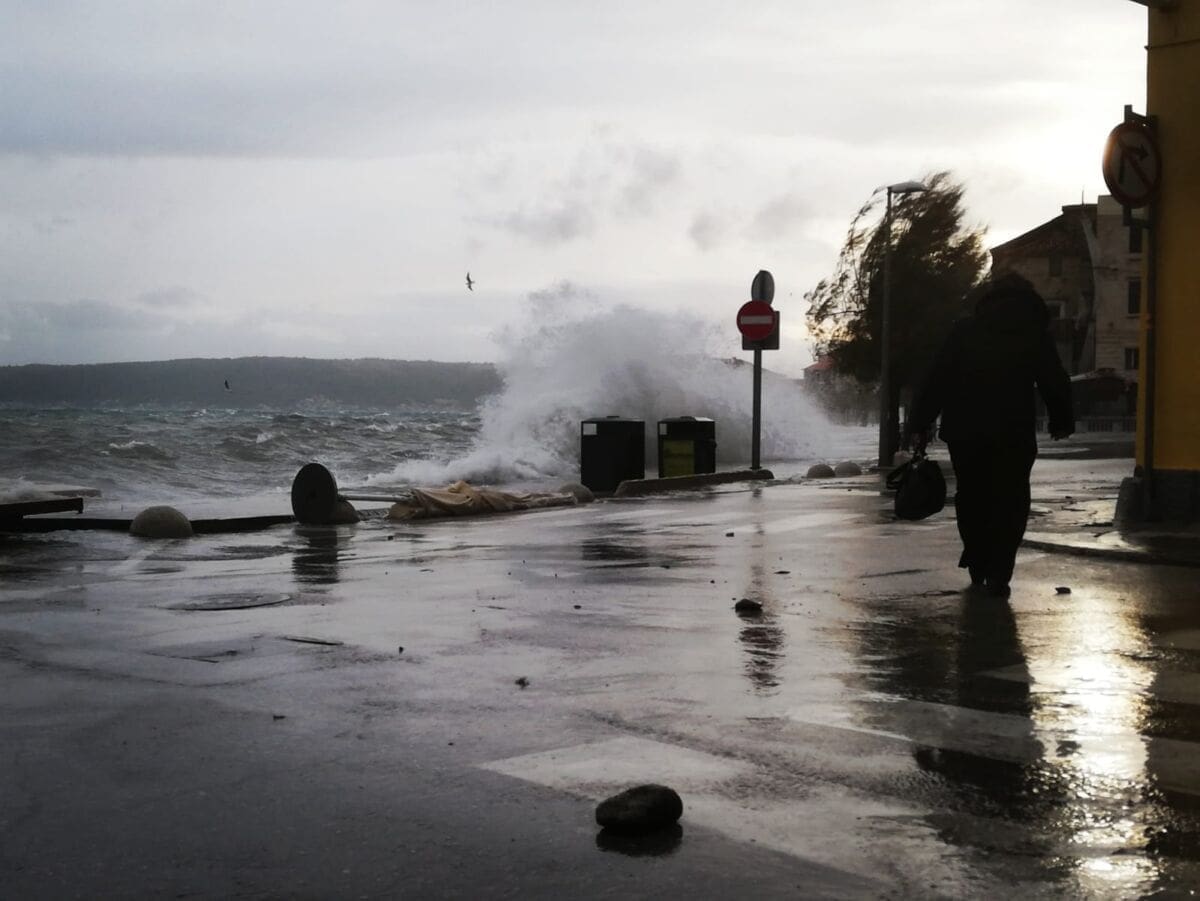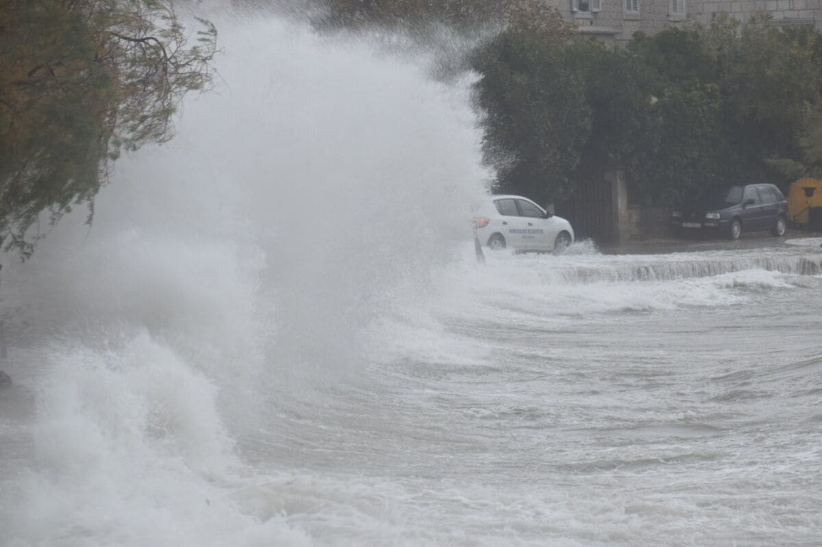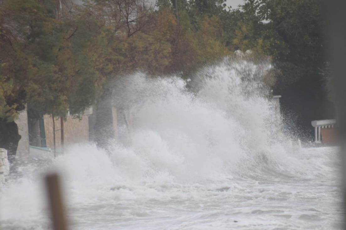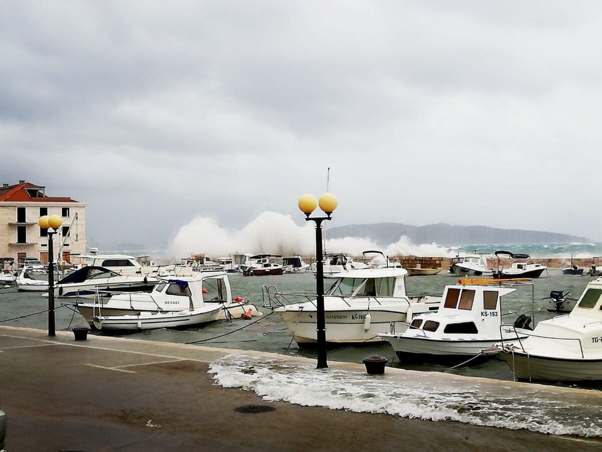 Najveća plima ove godine poplavila je kaštelansku rivu, a valovi su ponegdje donosili more sve do kućnih pragova. Plima je na rivu i na ceste uz more nasula žalo i kamenje.