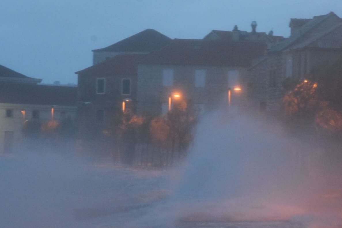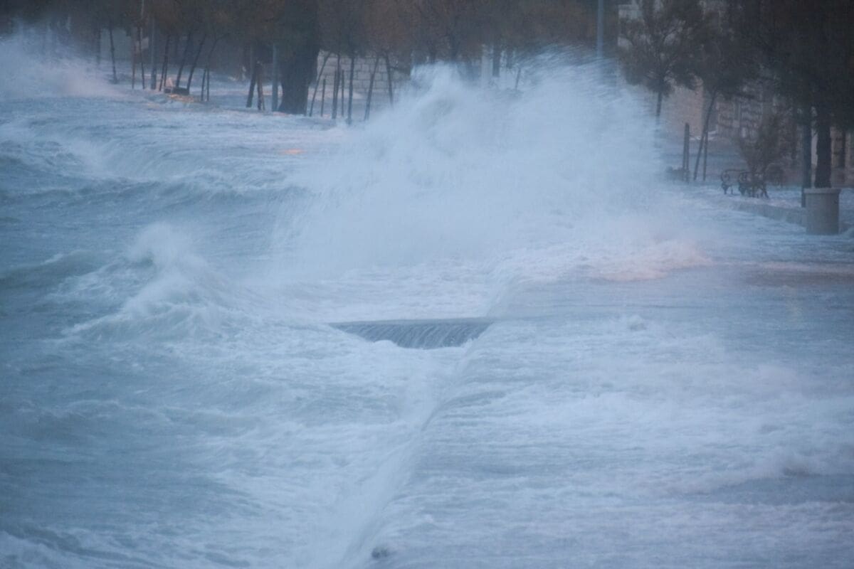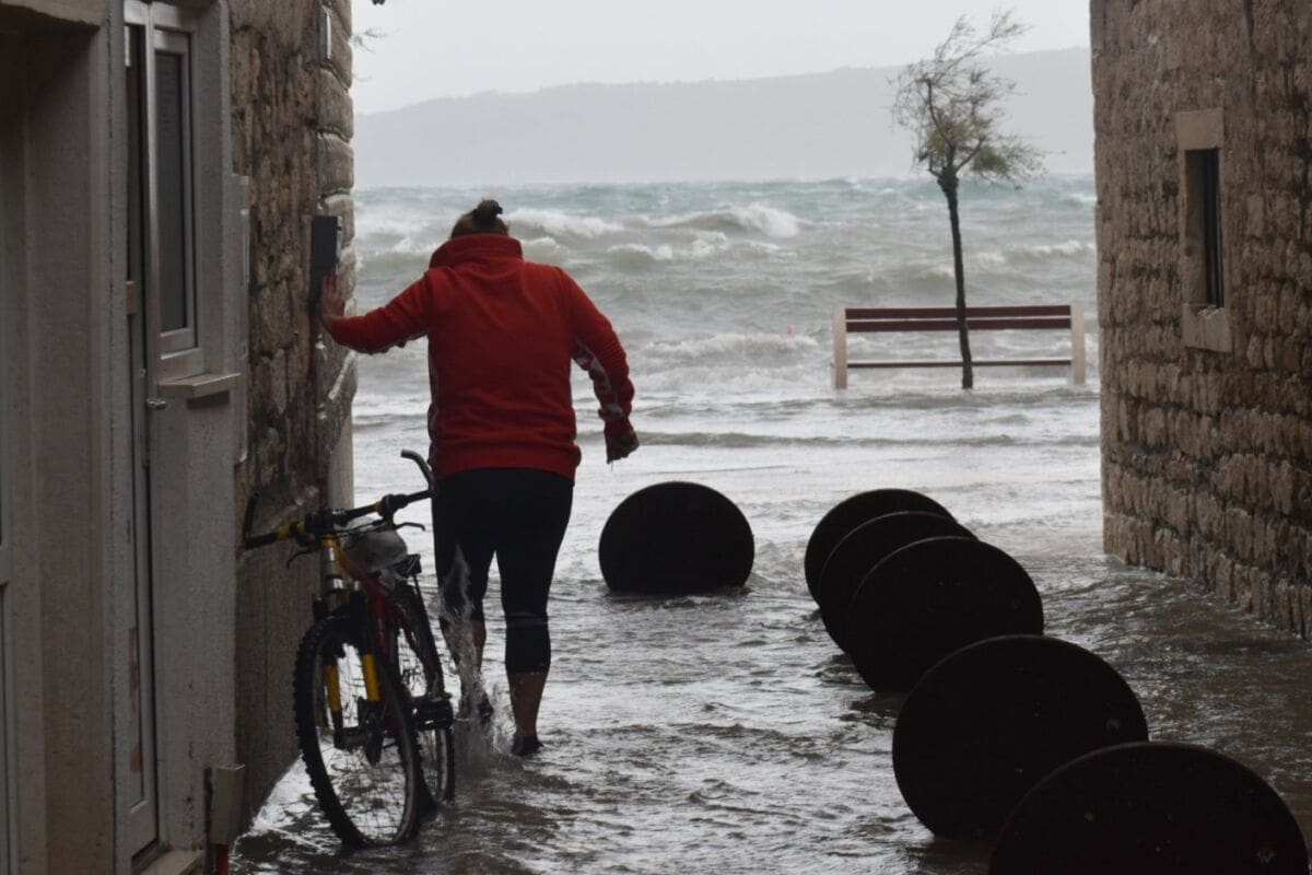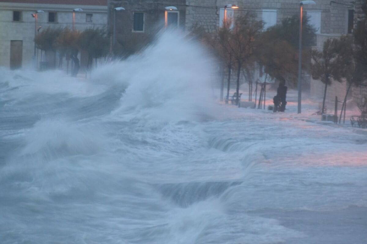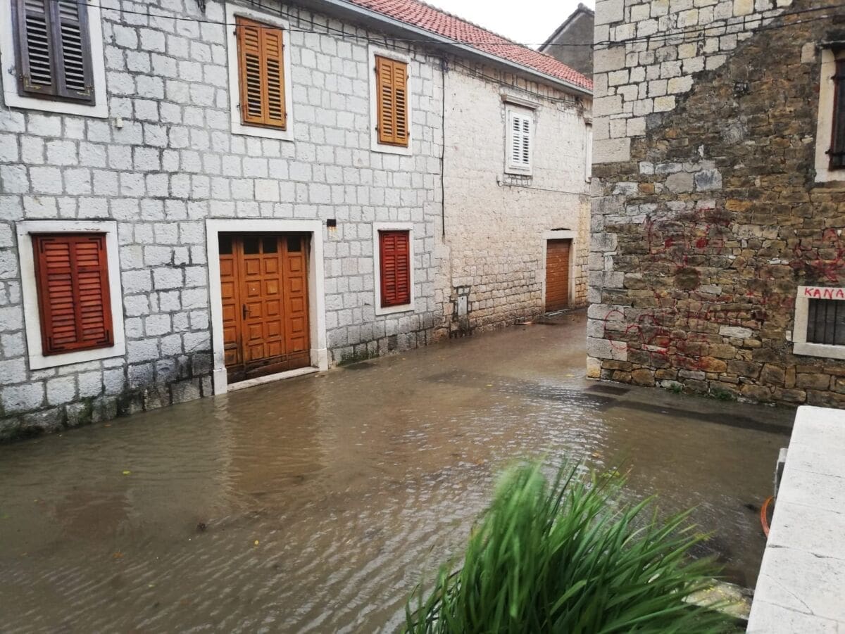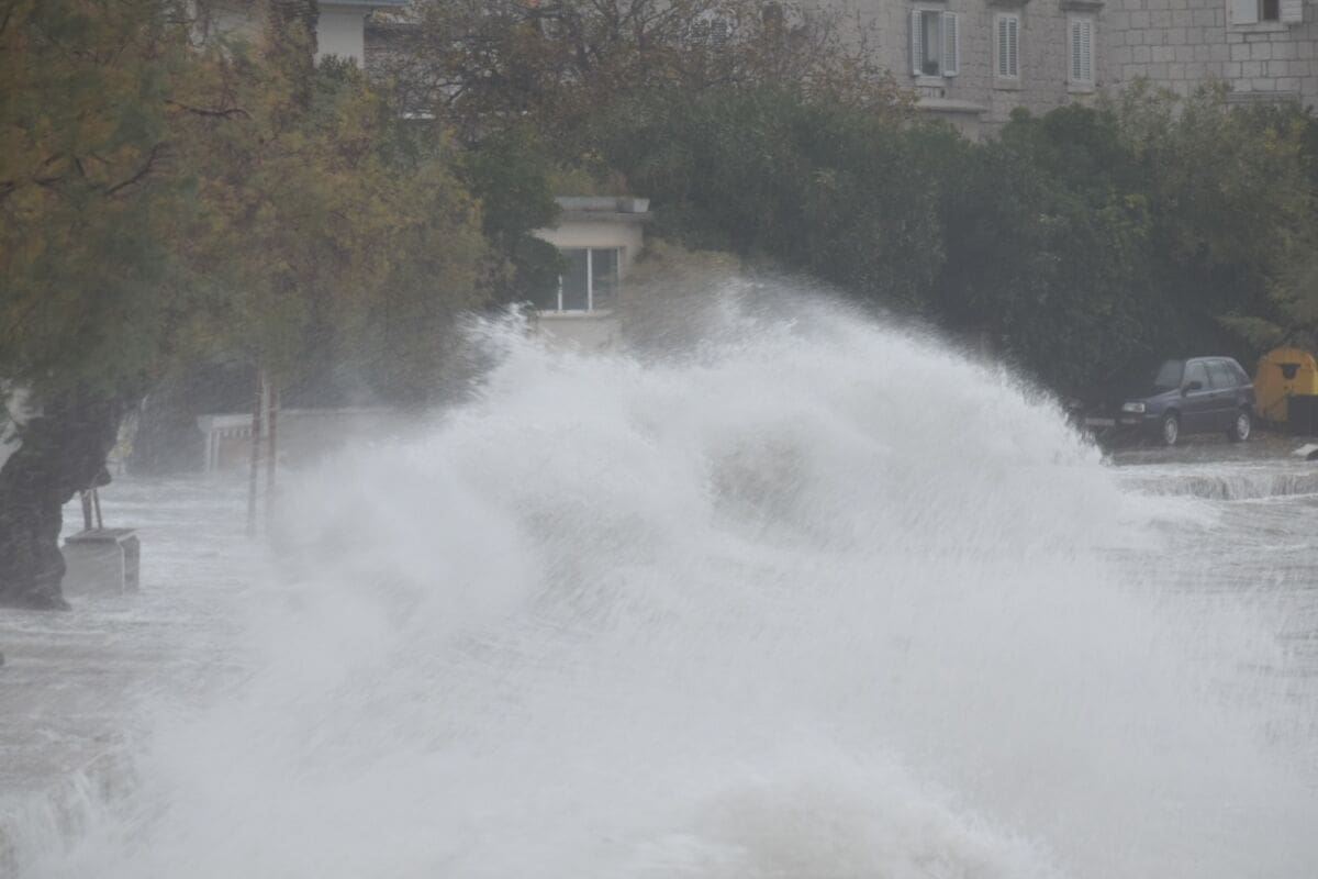 Najveća plima ove godine poplavila je kaštelansku rivu, a valovi su ponegdje donosili more sve do kućnih pragova. Plima je na rivu i na ceste uz more nasula žalo i kamenje.