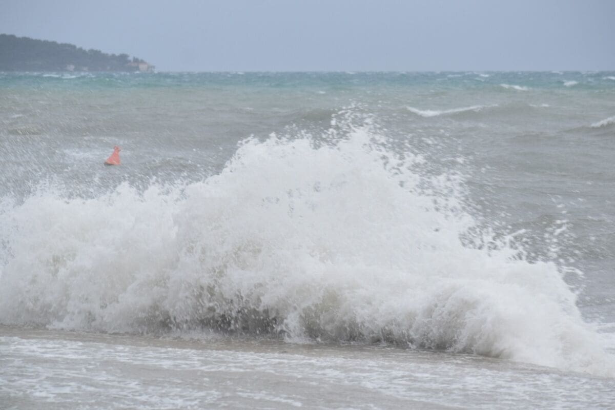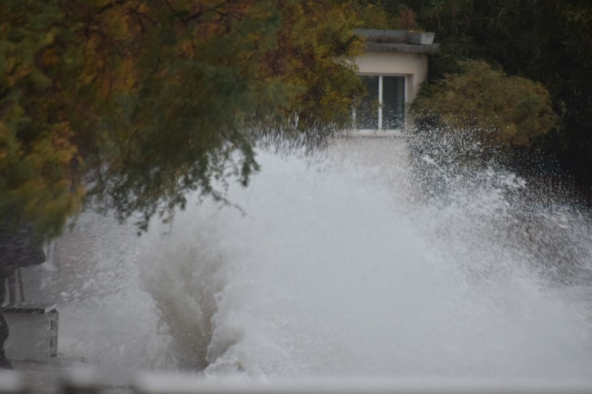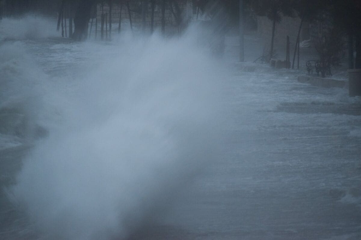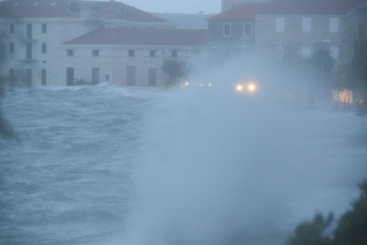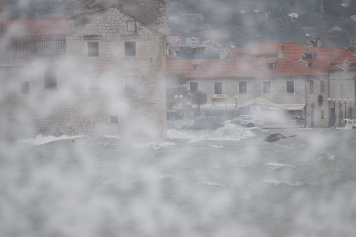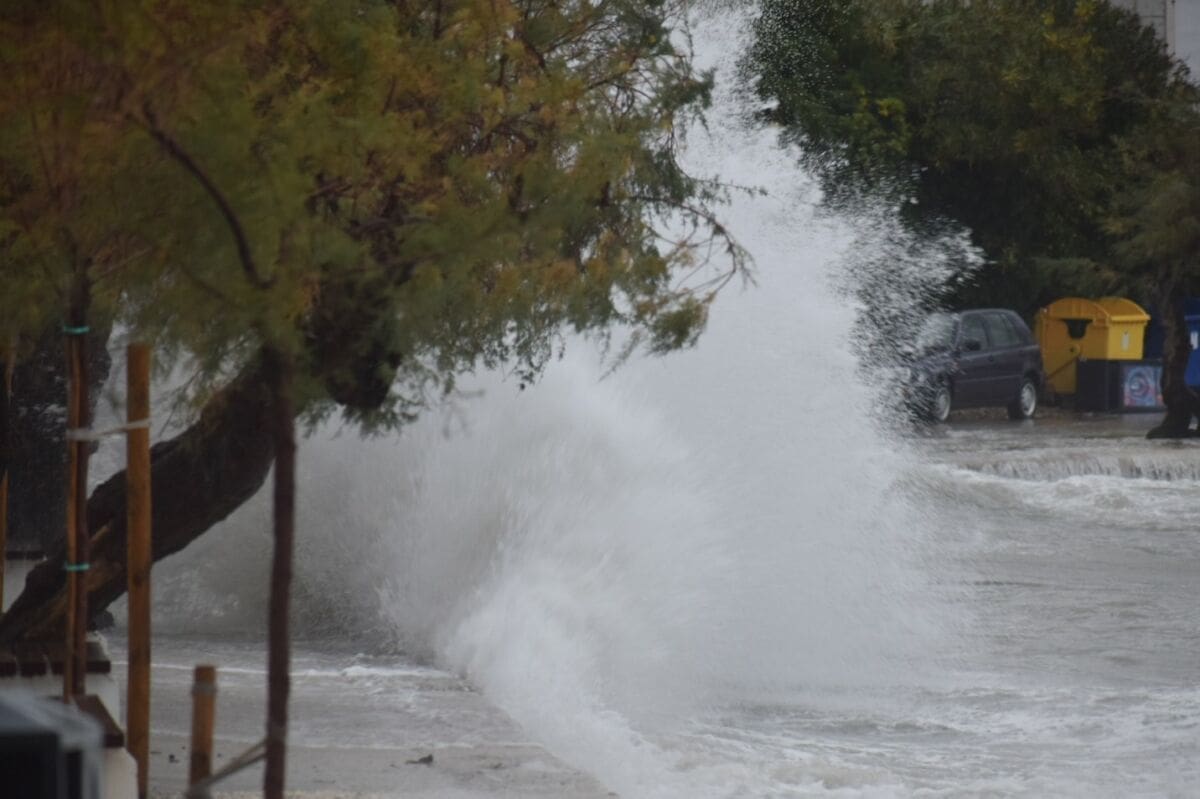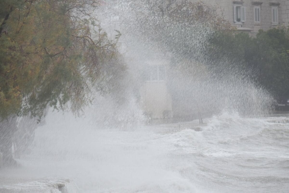 Najveća plima ove godine poplavila je kaštelansku rivu, a valovi su ponegdje donosili more sve do kućnih pragova. Plima je na rivu i na ceste uz more nasula žalo i kamenje.