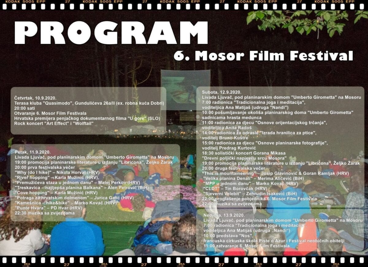 Održano je šesto izdanje Mosor film festivala. Događaj koji je trajao od 10. do 13. rujna 2020. donio je najbogatiji program do sada i rekordan broj posjetitelja. Da stvar bude zanimljivija, vidljivu "stepenicu" naprijed festival je napravio u vrijeme kad su im financije "skresane" gotovo na nulu, a pandemija koronavirusa odgodila je događaj s lipnja na rujan.