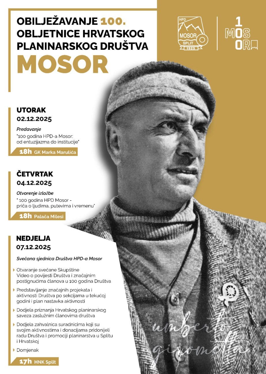 Hrvatsko planinarsko društvo Mosor ove godine obilježava velik jubilej – 100 godina postojanja, a tim povodom početkom prosinca organizira bogat trodnevni program posvećen povijesti društva, njegovim članovima te značajnoj ulozi koju ima u planinarskoj tradiciji Splita i Hrvatske.