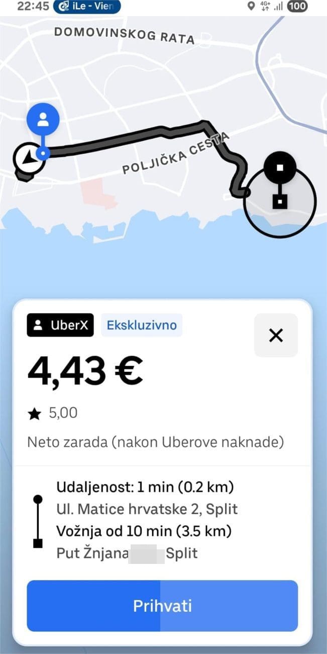 Tijekom večernjih sati festivala, točnije u 22:45, kako je vidljivo na fotografiji jedan vozač dobio je vožnju od Ulice Matice hrvatske do Put Žnjana. Dakle, udaljenost od 3.5 kilometara, procijenjeno trajanje vožnje oko 10 minuta. Neto zarada? Tek 4,43 eura.