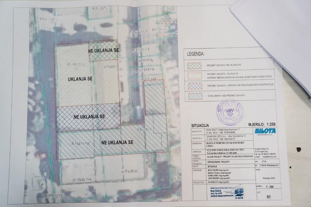 - Svima je u interesu da se napravi cesta, nitko nije protiv toga da se napravi taj put, ali ne na ovaj način. Najveći problem, odnosno spor u cijeloj ovoj priči je činjenica da ova zgrada, koja bi se trebala ukloniti predstavlja jednu građevinsku cjelinu. Građena je kao jedna građevina. Sada oni pokušavaju, investitor i izvođač uklanjanja, samo jedan dio zgrade srušiti. I laiku je valjda jasno da se ne može dio zgrade srušiti. - doznajemo od Bepa Marušića, odvjetnika koji u ovom postupku zastupa Dragu Veraju, vlasnika označenog prostora, poslovnog prostora koji NIJE otkupljen i koji se NE uklanja. Ali je u istom objektu koji se uklanja...
