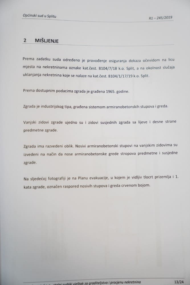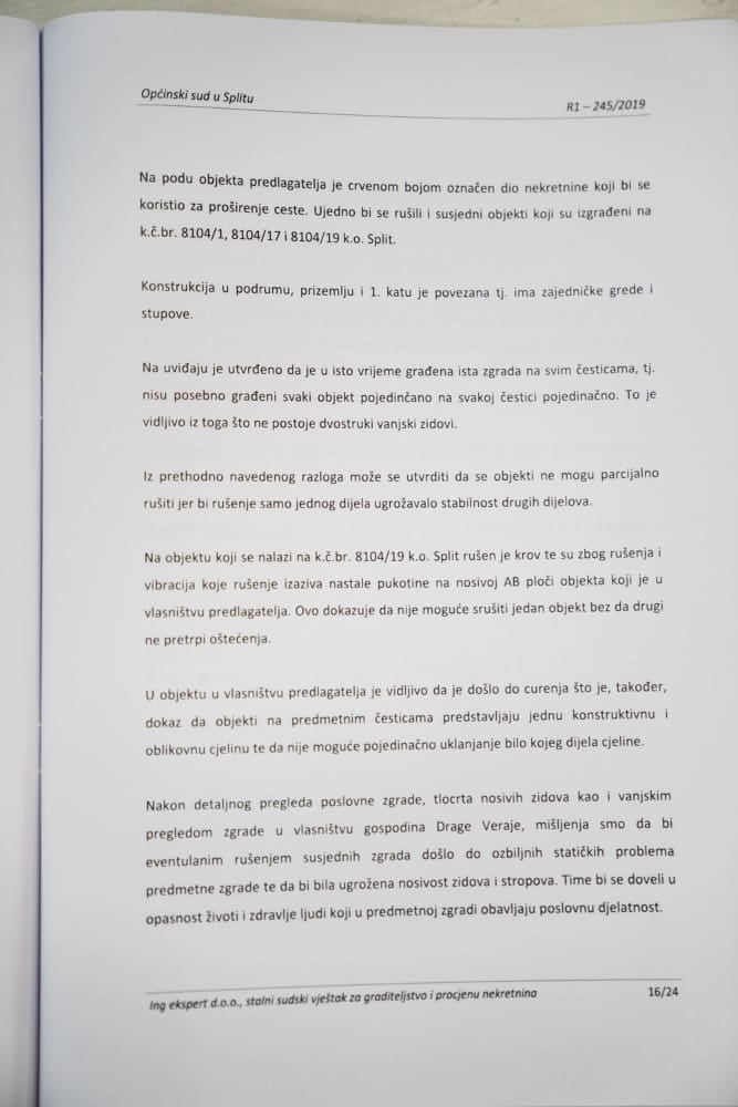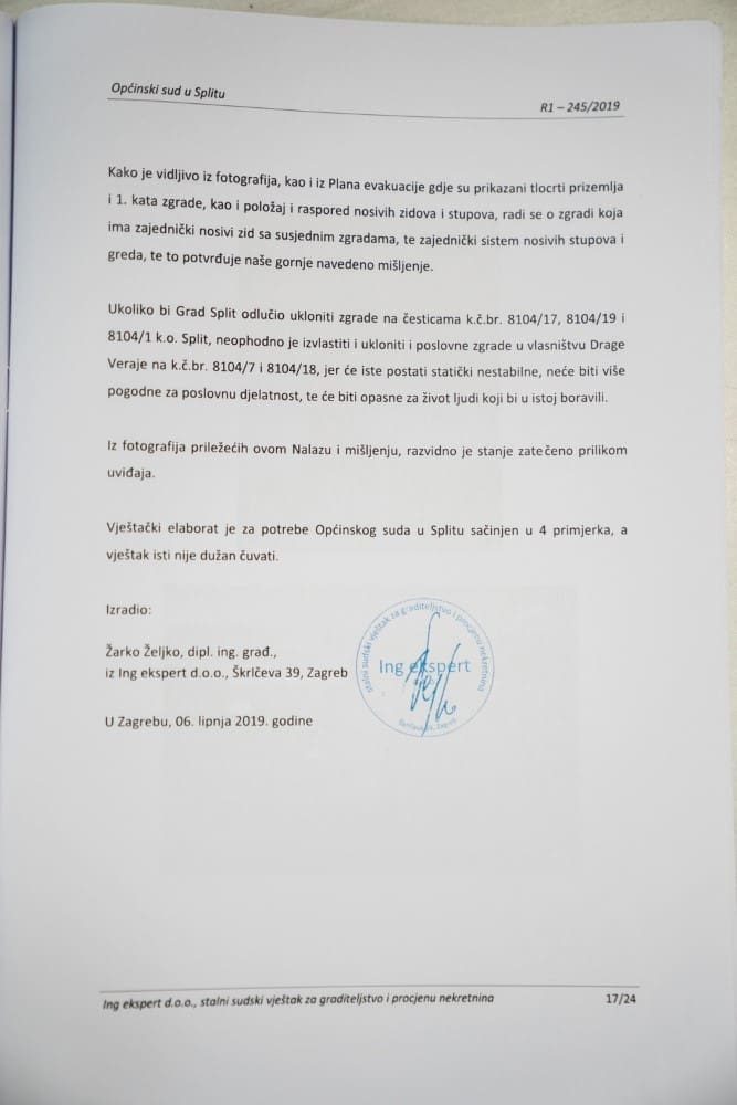 Mi smo radi toga tražili osiguranje dokaza, a sudski vještak Željko Žarko je točno napisao u svom mišljenju “ukoliko bi Grad Split odlučio ukloniti zgrade na česticama 8041719/1 k.o. Split, neophodno je izvlastiti i ukloniti poslovne zgrade u vlasništvu Drage Veraje jer će iste postati statički nestabilne, neće više biti pogodne za poslovnu djelatnost te će biti opasne za život ljudi koji bi u istoj boravili.” Eto, to je ono što je nama najveći problem.