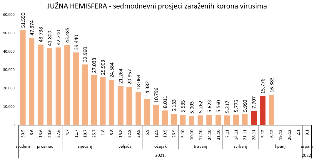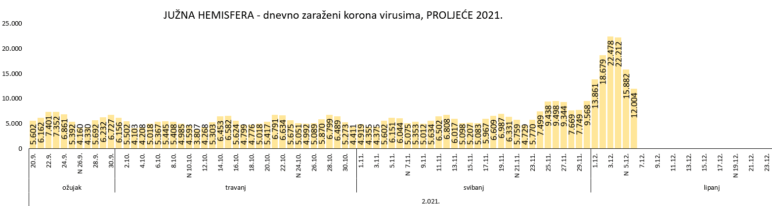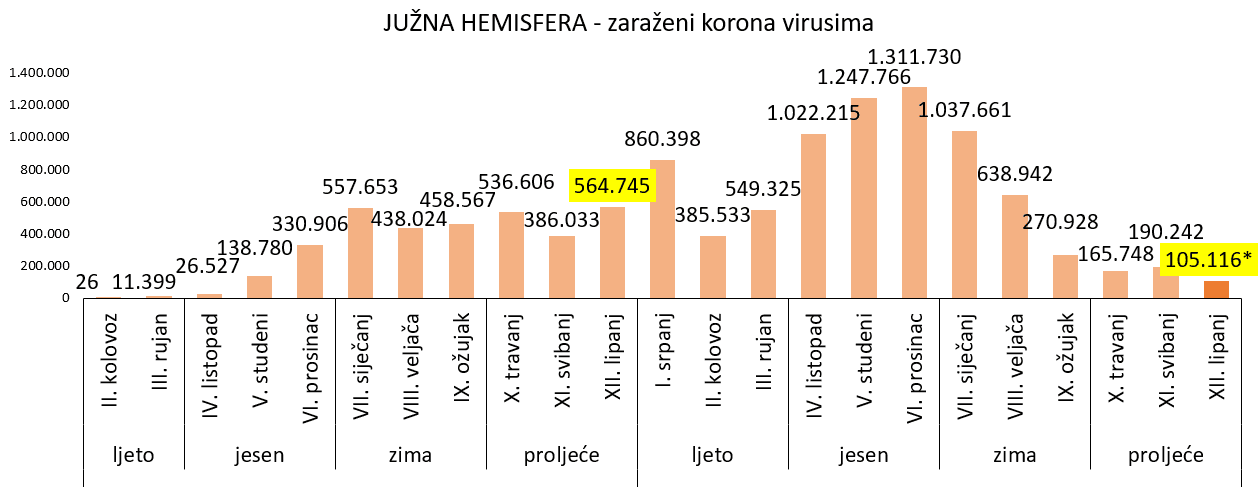 Dok se sjeverna hemisfera (SH) sad u početku prosinca, razdoblju kasne jeseni, kako je očekujuće sa sve većim brojem zaraženih korona virusima, JH je zakoračila u svoj mjesec lipanj, sami kraj proljeća pred početak kalendarskog ljeta. To je razdoblje kada se epidemije pa i pandemije virusnih respiratornih bolesti potpuno gase te ostaje malobrojno sporadično širenje uzročnika. Inače, zemlje JH jedine su prošle dvije pune jesensko-zimske udarne sezone za epidemije respiratornih infekcija. Njihova iskustva su se i ranije koristila u prognozama epidemija gripe na SH te su se pripremale i provodile potrebne mjere za nadolazeću sezonu gripe na SH.
