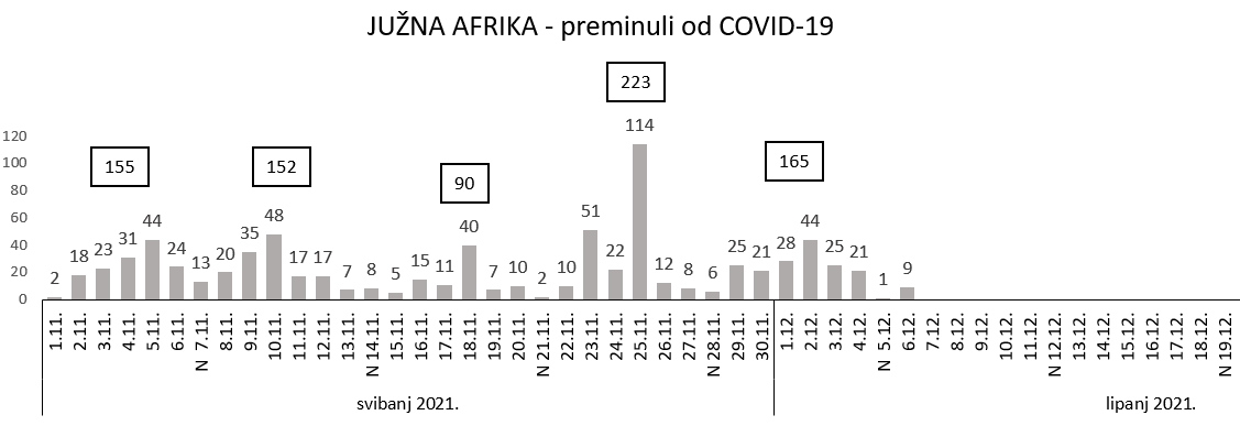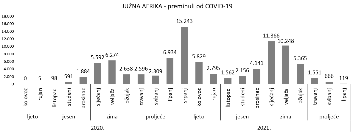 Dijagram preminulih od COVID-19 slijedi dijagram zaraženih s kašnjenjem od dva tjedna do mjesec dana. Iz ovog dijagrama za Južnu Afriku pokazuje stalno smanjivanje broja preminulih od siječnja do svibnja. Brojevi preminulih su značajno manji nego u istim mjesecima prošle godine. (Učinak procijepljenosti starijeg stanovništva). Povećanje broja preminulih prošle godine u lipnju i mjesecu srpnju, koji je rekorder po broju preminulih, posljedica je pojave beta soja virusa korone. Treba . napomenuti da je cjepivo za JH došlo u uporabu poslije kolovoza.
