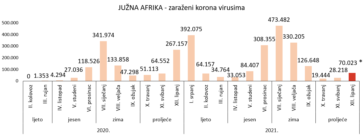 U dosadašnjem tijeku pandemije Južna Afrika i ukupno JH prošli su kroz dva puna jesensko-zimska epidemijska vala korona pandemije. Između njih je ljetni izvansezonski val izazvan beta sojem virusa korone. Sada na ulasku u ljetno razdoblje u mjesecu lipnju ponovno se JH suočava s novim izvansezonskim epidemijskim valom ovaj put izazvan novim omikron sojem virusa korone. U samo šest dana mjeseca lipnja zabilježeno je više od 70 tisuća novozaraženih. Procjenjuje se da bi se ovakvim tempom zaražavanja mogao dostići broj zaraženih iz srpnja 2021. kada je to bio drugi mjesec po veličini broja zaraženih koronom.