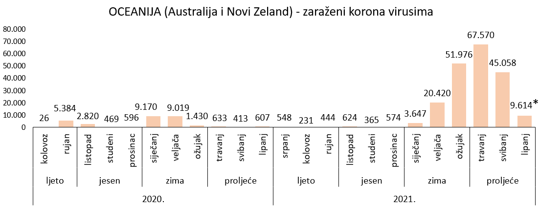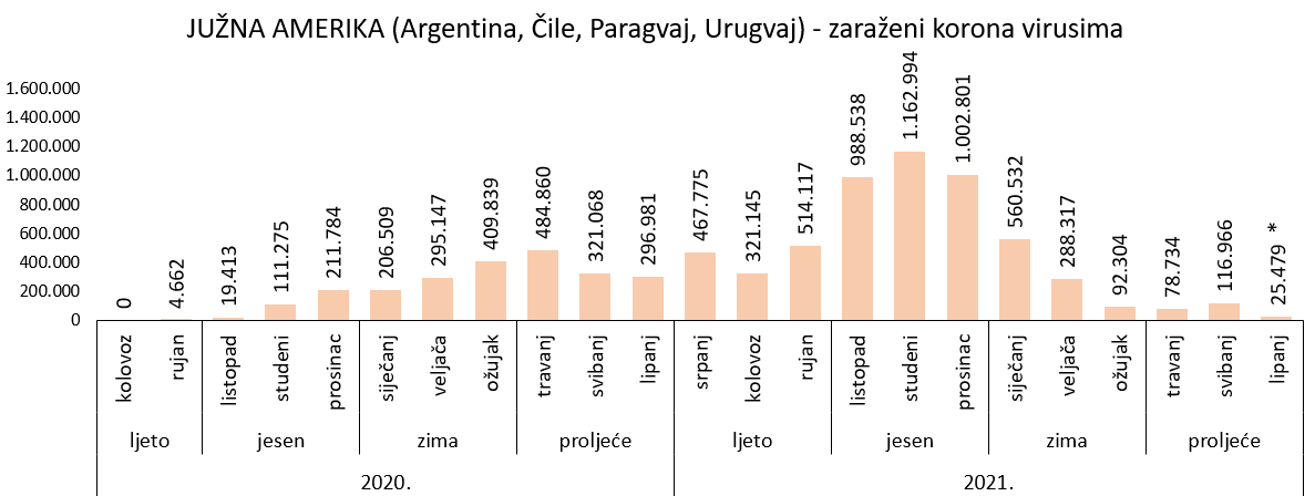 Pandemija korona virusa je kao i svugdje počela 2020. godine u drugom mjesecu (veljača na SH, kolovoz na JH). Na JH ljetne klimatske prilike nisu pogodovale širenju viruse te se pravi epidemijski uzlet javlja u mjesecu studenom s vrhuncem u siječnju (srpnju na JH). Međutim epidemija ne jenjava u u ožujku već se broj zaraženih u proljeću povećava čemu su uzroci pojave novih sojeva korona virusa beta soj u Južnoj Africi u ožujku (9. mjesec na SH) i gama soj u Južnoj Americi u lipnju (12. mjesec na SH).