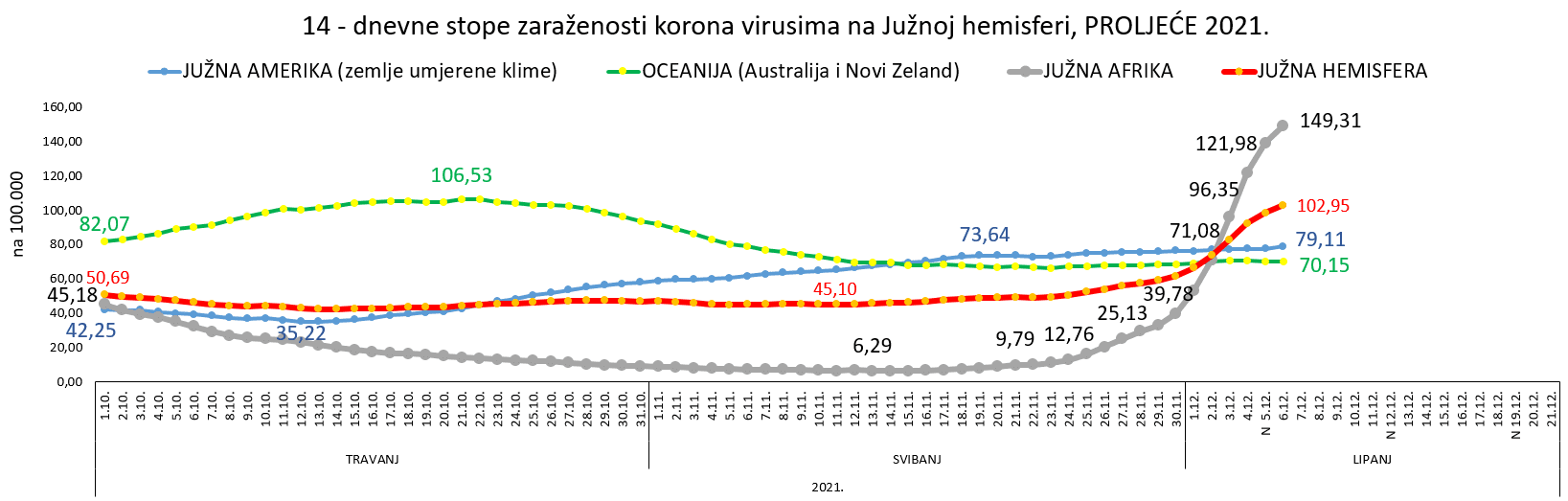 Usporedbom 14-dnevnih stopa zaraženosti korona virusima između područja JH vidi se da je stopa u Južnoj Africi na dan 6. lipanj dvostruko veća nego u Južnoj Americi i Oceaniji čije su stope sukladne ulasku u klimatološko ljetno razdoblje za zemlje umjerenog klimatskog područja.