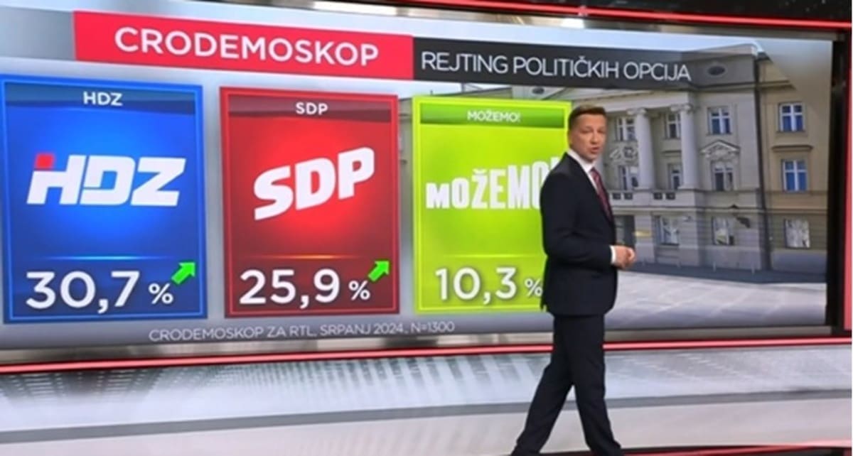 Da su izbori provedeni početkom srpnja HDZ bi bio relativni izborni pobjednik sa zadržanom prednosti ispred prvog pratitelja, SDP-a, ali i ostalih političkih stranaka. Tako je u mjerenju rejtinga stranaka provedenom između 1. i 4. srpnja HDZ zabilježio izbor od 30,7 posto (u lipnju 29,8 posto). Anketu je večeras objavio RTL, prenosi Index.