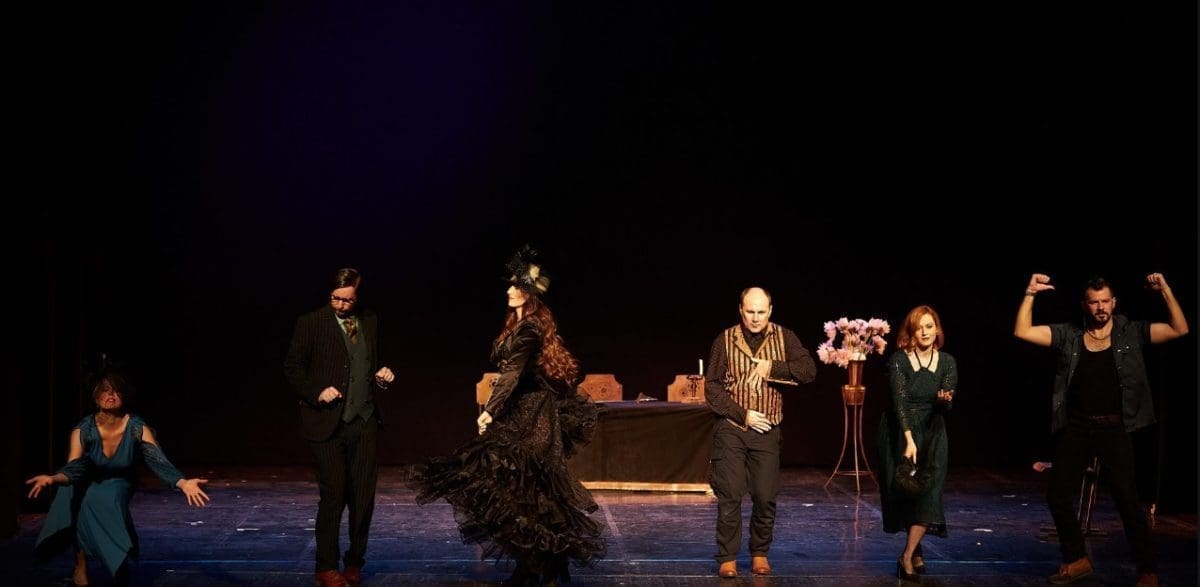 Mrożekove „Udovice“ počivaju na tekstu koji bi htio biti ironičan, crnohumorski i sličan teatru apsurda, no na trenutke je toliko nekultivirano glup da ni glumački šarm, dikcija i snalažljivost ne pomažu. „Moj muž nije ni prstom mrdnuo, iako je to bio njegov pokop“, kaže prva supruga, a druga odvraća „Moj je na pokopu bio potpuno miran.“ Prvi (i sasvim logičan) izostanak smijeha tijekom paradoksalna ćaskanja već naslućuje katastrofu. Čudnjikavu dinamiku neduhovitih dijaloga donekle razbija Konobar (izvrsni Miroslav Čabraja) koji djeluje kao svojevrstan korektor dramskih situacija, dramaturg ili šaptač. On pokušava direktno utjecati i na dvije posvađane udovice, koje shvaćaju da je svaka od njih bila ljubavnica muža one druge, i na dva groteskna muža zaraćena oko Treće, misteriozne dame u crnom, s cvjetnim oglavljem i maskom smrti – Mrożekovom direktnom referencom na kulturu smrti o kojoj je promišljao za vrijeme boravka u Meksiku.