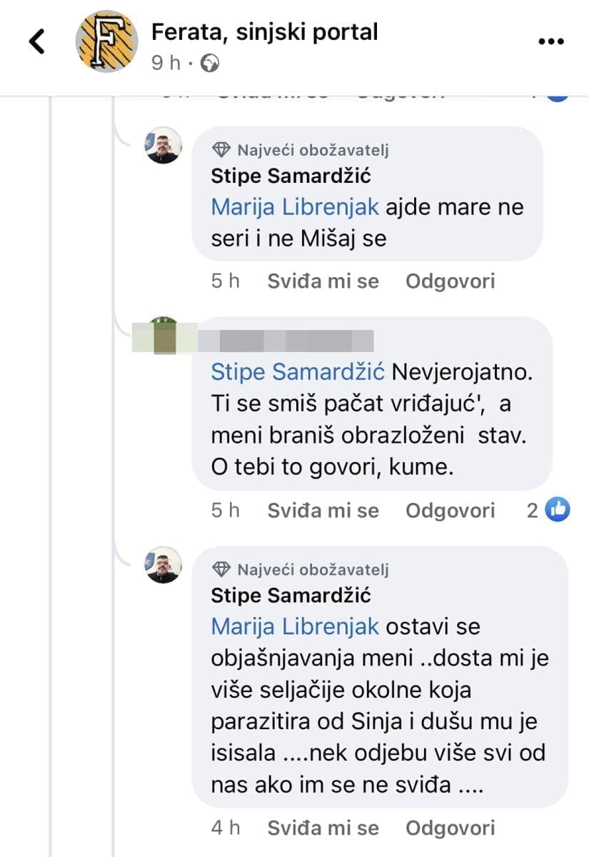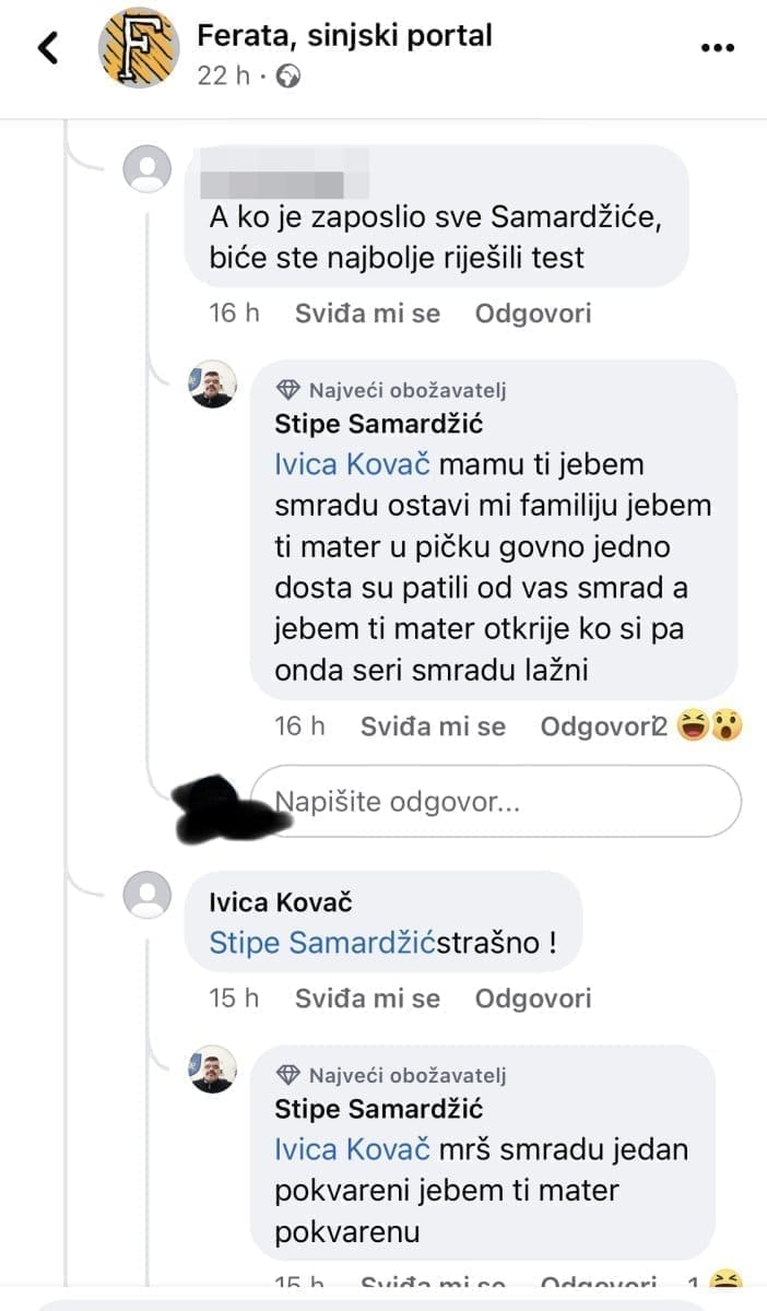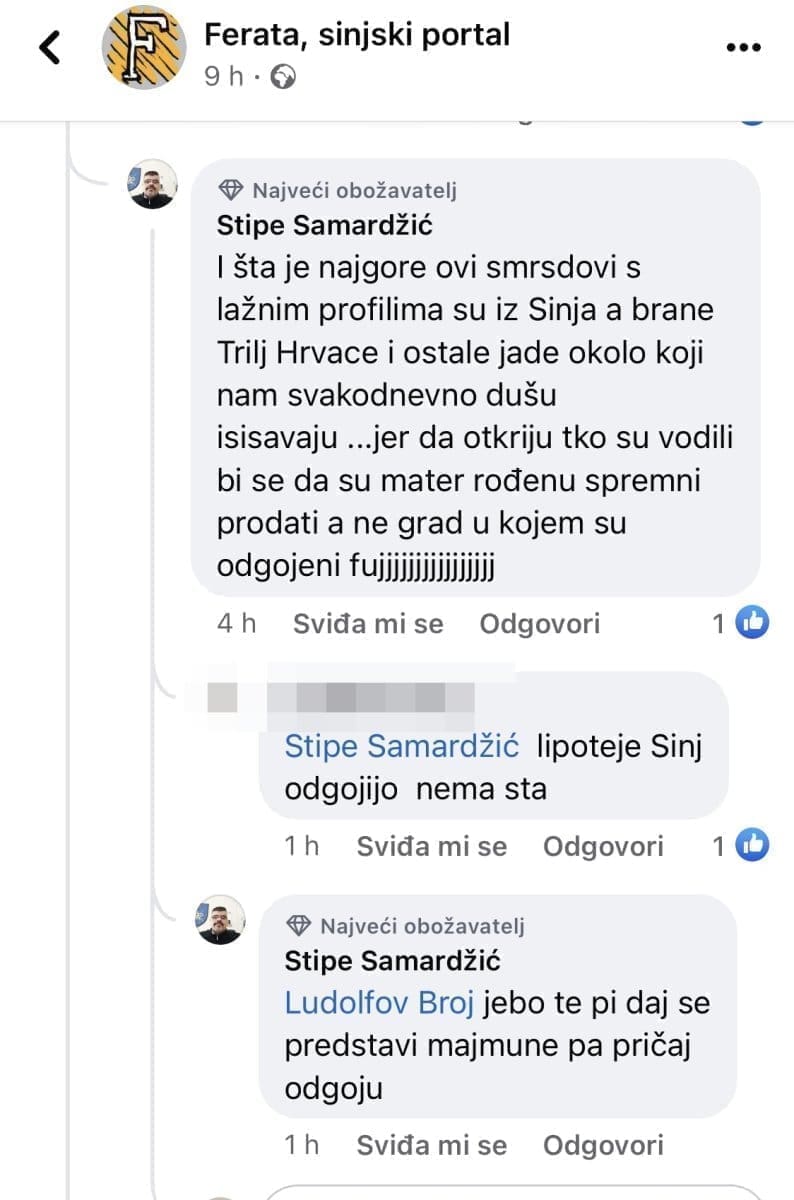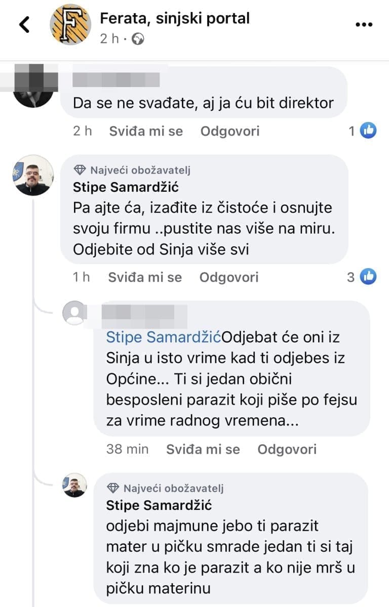 "Najoštrije osuđujemo izljeve mržnje, prijetnji, netolerancije, prostakluka i vulgarnosti koje je sa svoga Facebook profila, dijelom i kroz radno vrijeme iznio i iznosi gradski službenik Stipan Samardžić u raspravi na sinjskom informativno društvenom portalu Ferata, u svezi objavljenog članka o međuvlasničkim odnosima u gradskoj komunalnoj tvrtki Čistoća Cetinske krajine.