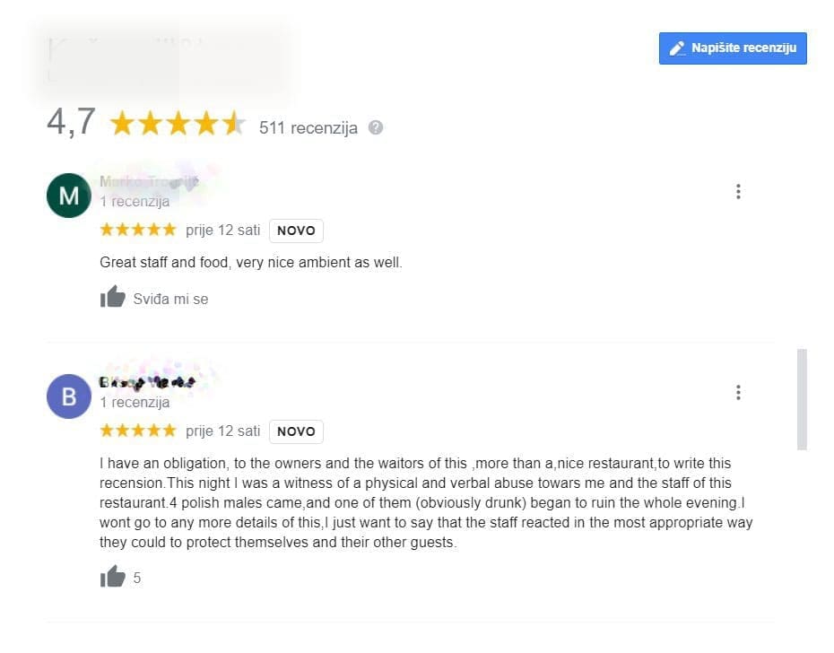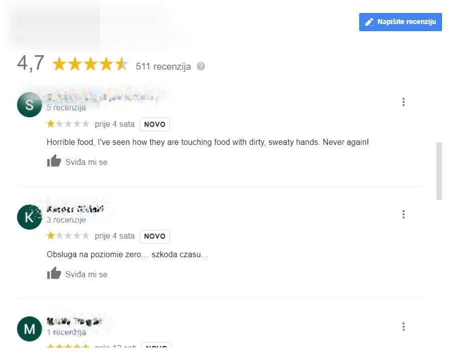 Uslijedio je niz recenzija za ovaj ugostiteljski objekt na Googleu