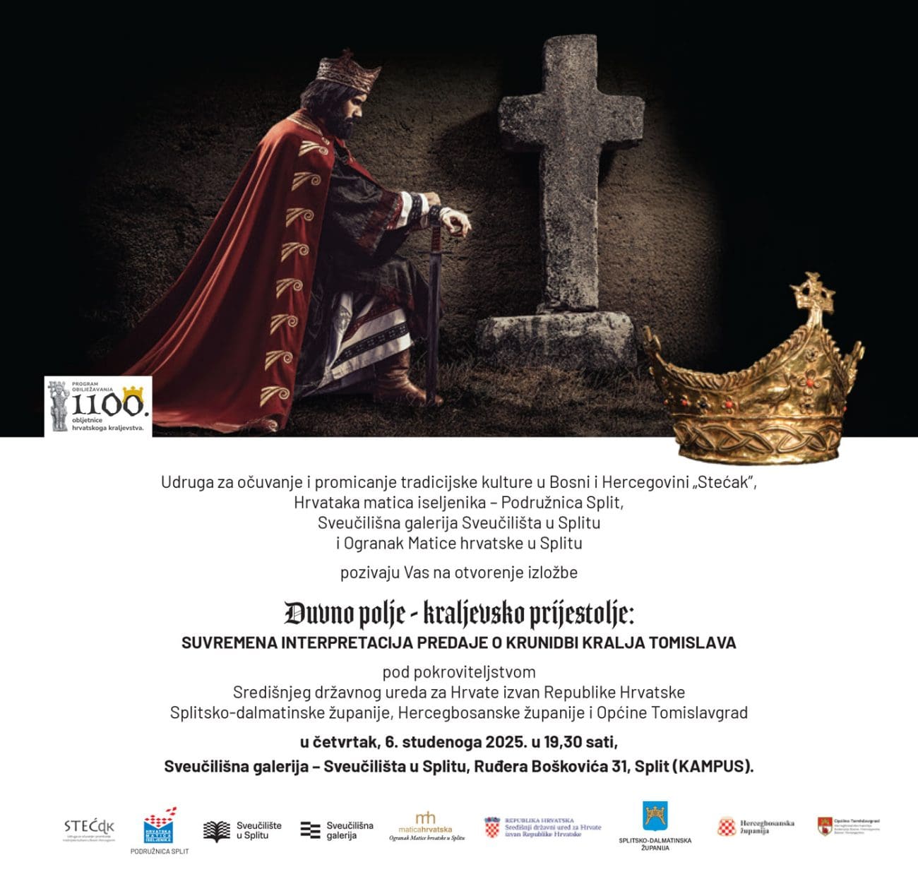 Multimedijalna izložba "Duvno polje – kraljevsko prijestolje: Suvremena interpretacija predaje o krunidbi kralja Tomislava" otvara se u četvrtak, 6. studenoga 2025. u 19:30 sati u Sveučilišnoj galeriji Sveučilišta u Splitu (Kampus, Ruđera Boškovića 31). Ova atraktivna kulturna manifestacija, koja se odvija pod pokroviteljstvom Središnjeg državnog ureda za Hrvate izvan Republike Hrvatske, Splitsko-dalmatinske županije, Hercegbosanske županije i Općine Tomislavgrad, donosi jedinstveno iskustvo koje spaja povijest, umjetnost i suvremenu tehnologiju u jednoj cjelini, stvarajući most između srednjovjekovne Hrvatske i digitalnog doba.
