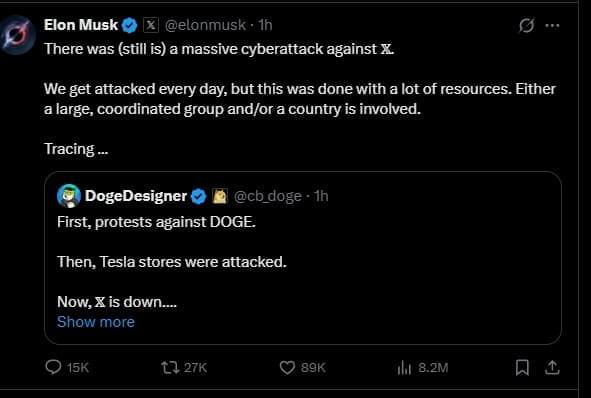 Samo nekoliko sati nakon što su padovi sustava ostavili X nedostupnim tisućama korisnika, Elon Musk izjavio je da je njegova društvena mreža bila meta "masovnog kibernetičkog napada."