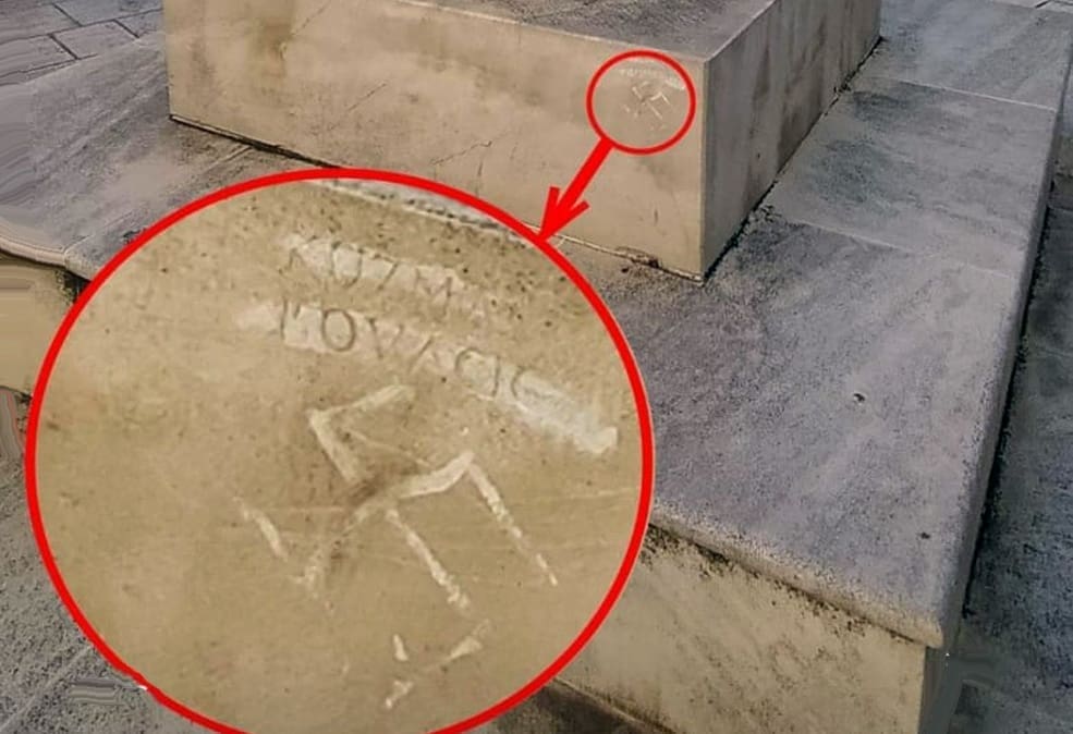 Napravljeno je to nekom vrstom bijele boje i to odmah do uklesanog imena autora, Kuzme Kovačića.