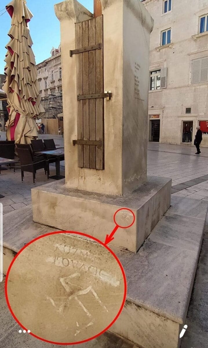 Skupina građana, sjedeći u jednom od kafića na Pjaci u Splitu, primijetila je da je na postolju jarbola ucrtan kukasti križ.
