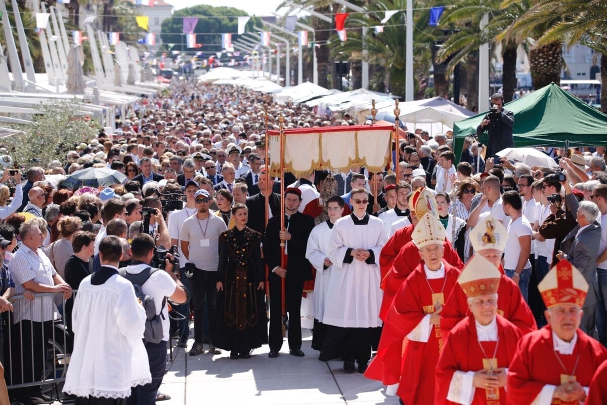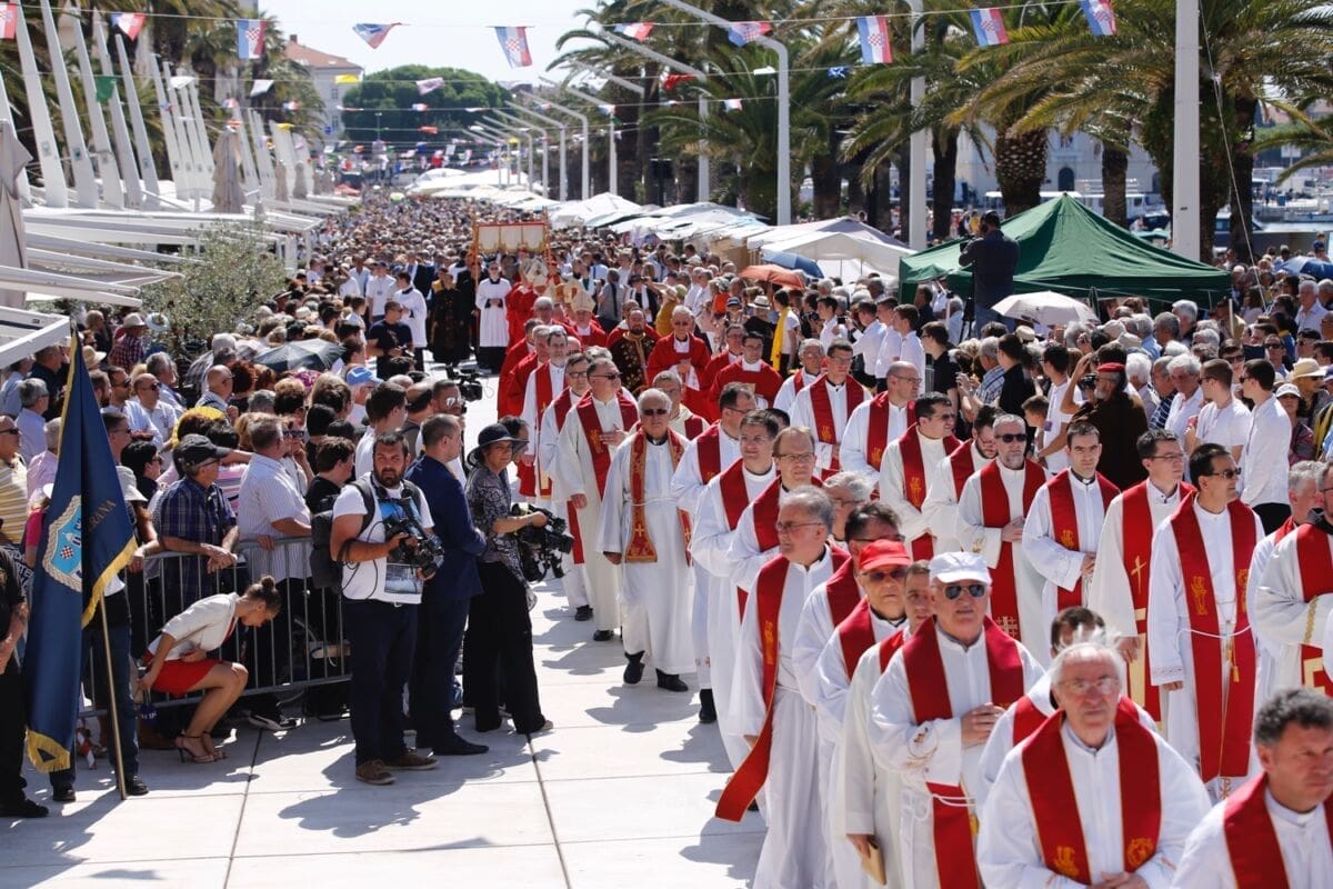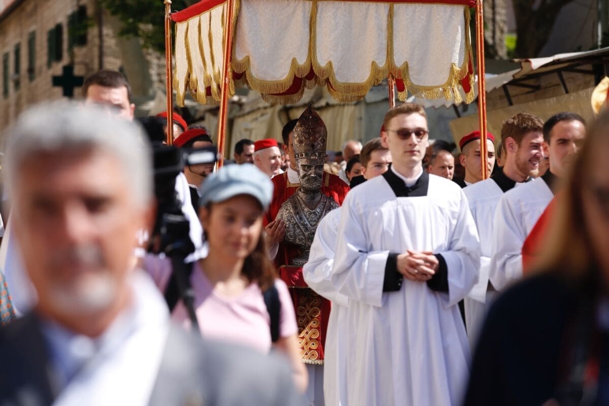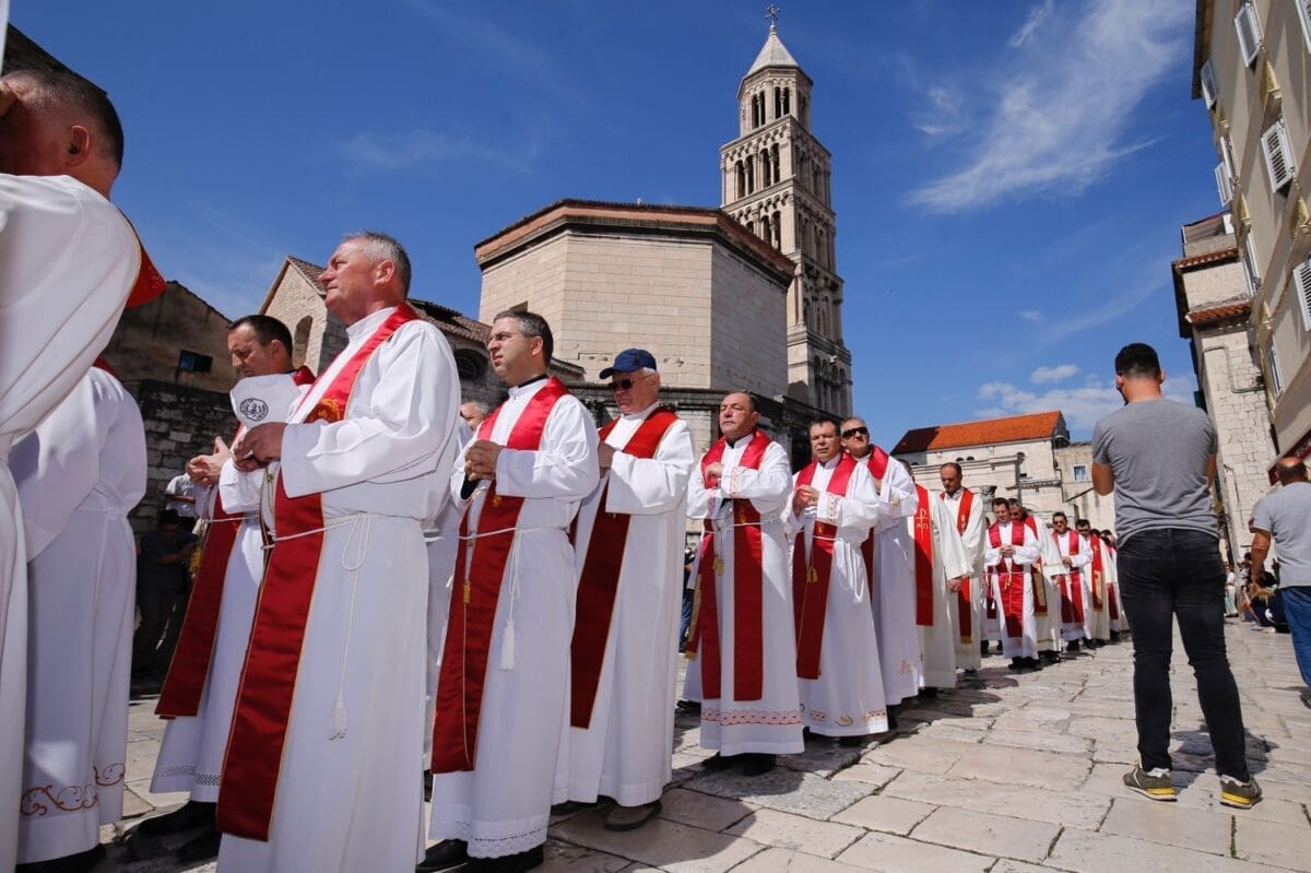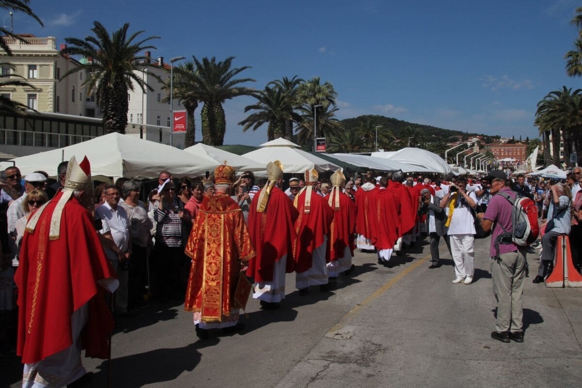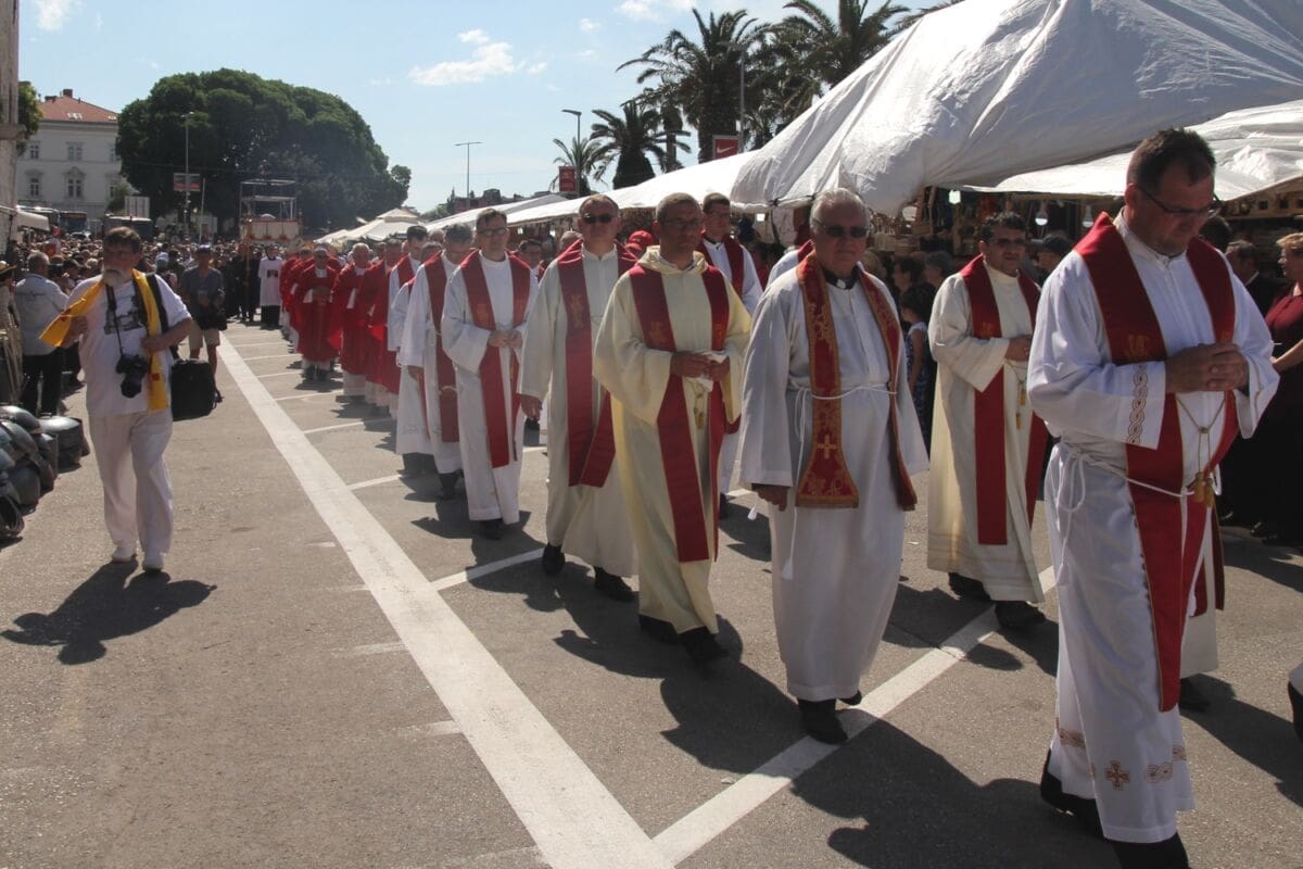 Procesija je krenula s Peristila u 10 sati predvođena nadbiskupom splitsko-makarskim Marinom Barišićem i šibenskim biskupom Tomislavom Rogićem te moćima svetog Duje, prenešenim sve do crkve Svetog Frane, gdje je održano misno slavlje koje je potrajalo do 12 sati.