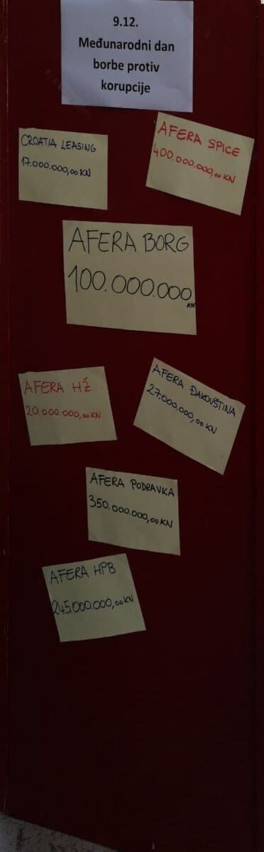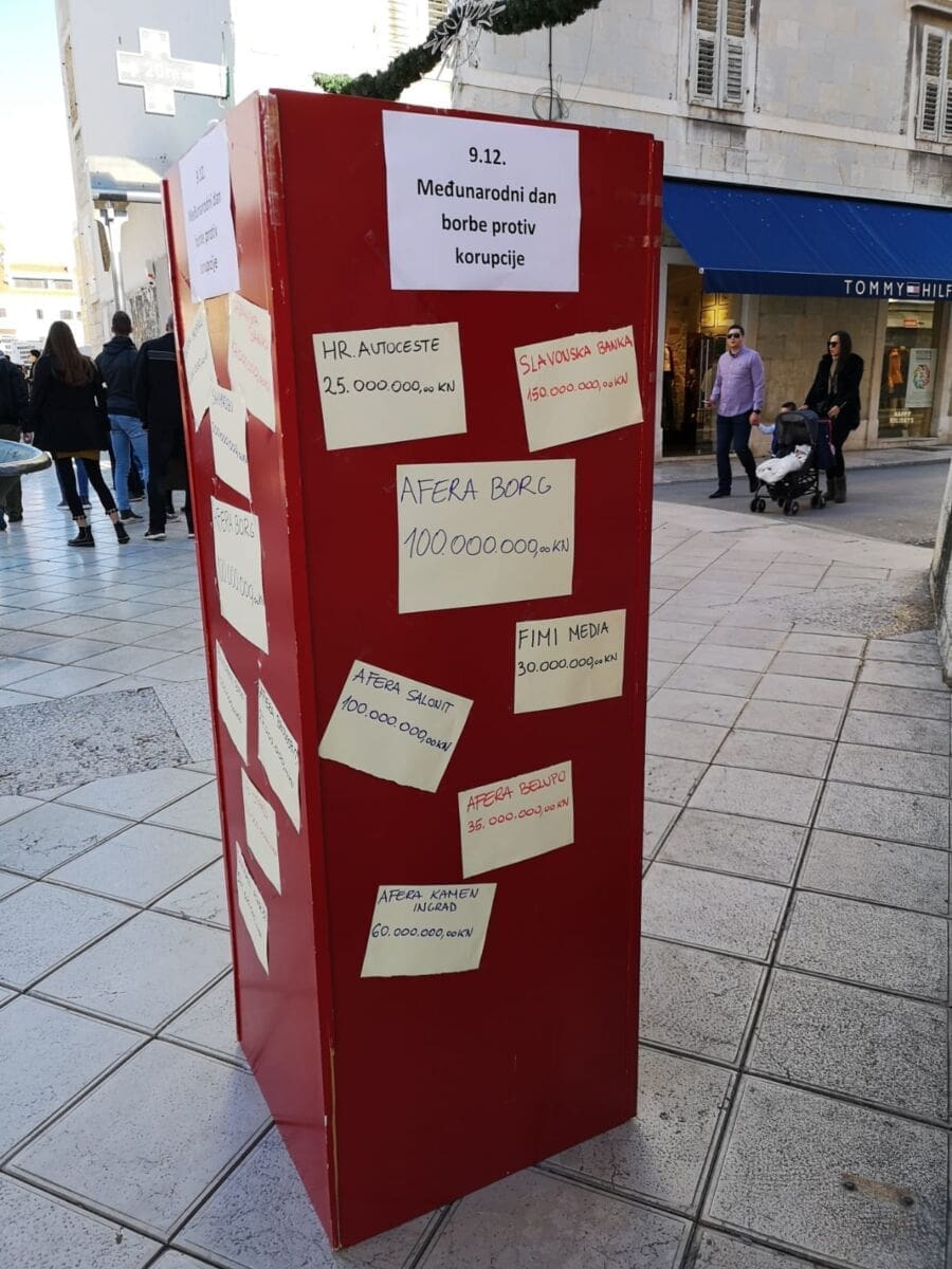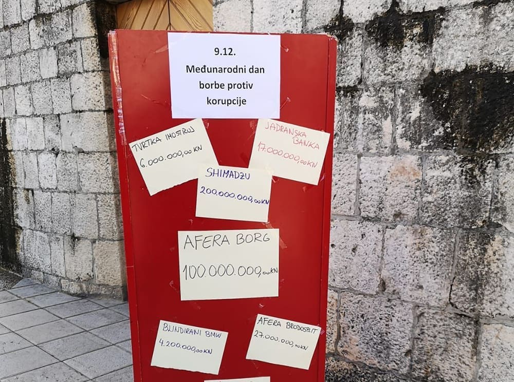 Danas je 9. prosinac – Međunarodni dan borbe protiv korupcije koji se obilježava od 2003. godine kada je Opća skupština UN posebnom rezolucijom ukazala na problem korupcije i potrebu svakodnevne borbe protiv nje. Tim povodom na Marmontovoj ulici u Splitu je osvanuo stup na kojem su izvješeni iznosi kojima je Hrvatska oštećena u raznim korupcijskim aferama.