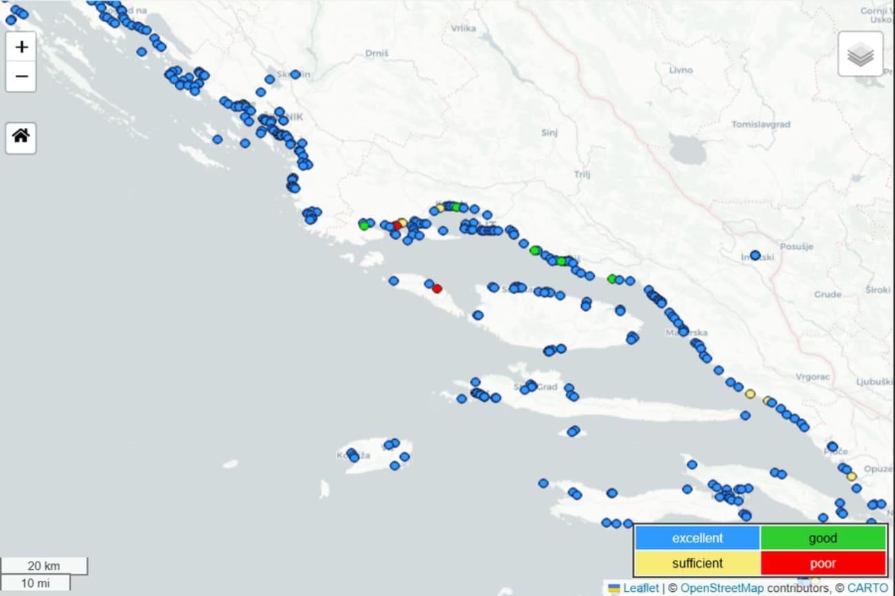 More je zadovoljavajuće kvalitete na plaži Gabine u Kaštel Štafiliću, ispred Hotela Jadan u Segetu, u Segetu Donjem na plaži Staro Selo, u Živogošću te u Drveniku na trajektnom pristaništu.