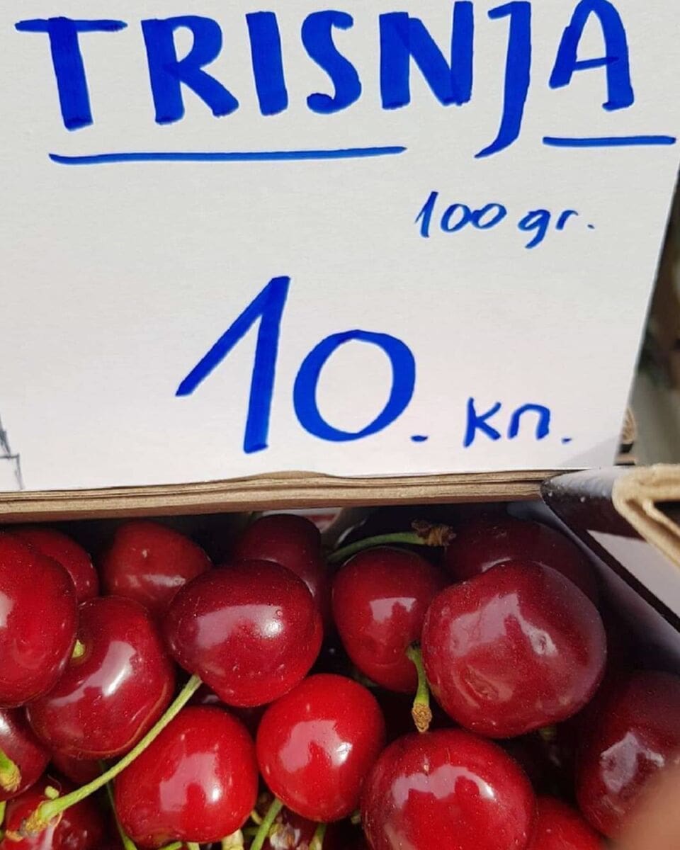 Naime, uz trešnje stoji da koštaju 10 kuna, ali važno je pročitati i sitna slova - 10 kuna izdvojit ćete za 100 grama crvenih plodova. Drugim riječima, jedan kilogram koštat će vas - ni manje ni više nego 100 kuna.