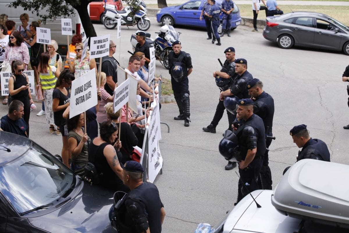 Prosvjednici su sjeli na cestu i blokirali izlaz. Viču 'Priziv savjesti', te 'Danas Cesare, sutra Duje'.