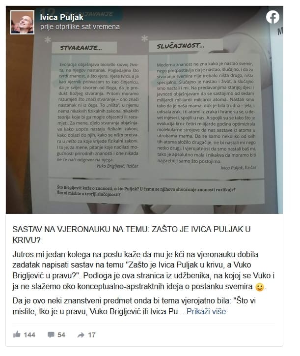 Profesor, znanstvenik i član stranke Pametno Ivica Puljak u ponedjeljak se na svom Facebooku osvrnuo na informaciju koju mu je dojavio kolega s posla. Naime kćerka njegovog kolege na vjeronauku imala je zadatak napisati sastavak sa zanimljivom temom. Kako je otkrio Puljak, na satu vjeronauka učenici su trebali napisati sastav na temu: "Zašto je Ivica Puljak u krivu, a Vuko Brigljević u pravu?"