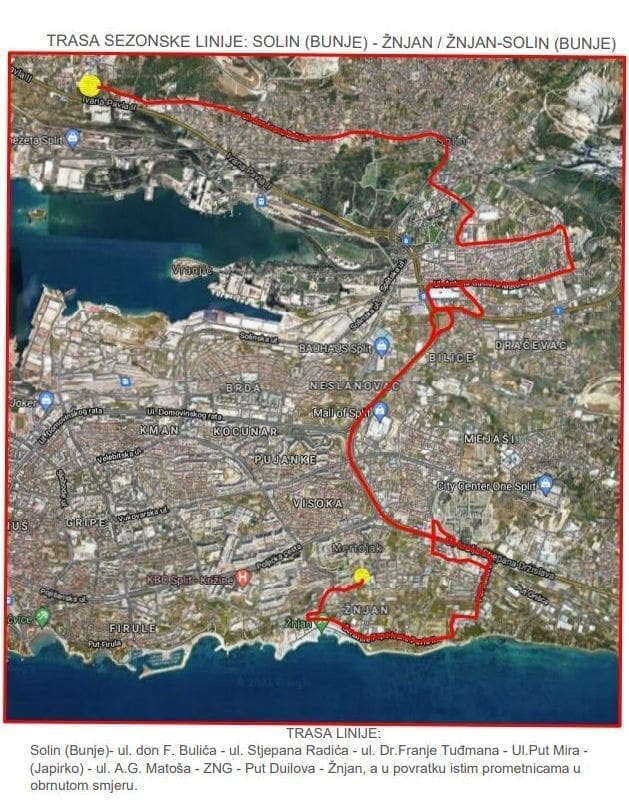 Na zahtjev Grada Solina, a u skladu s potpisanim Ugovorom o pružanju komunalne usluge i o nadoknadi troškova prijevoza putnika u javnom prometu prema Uredbi EU 1370/2007 od ponedjeljka 12. srpnja do 15. rujna 2021., uvodi se sezonska linija na relaciji Solin/Bunje – plaža Žnjan s polaskom u 15.30 sati i povratkom sa Žnjana u 19.30 sati, svaki dan.