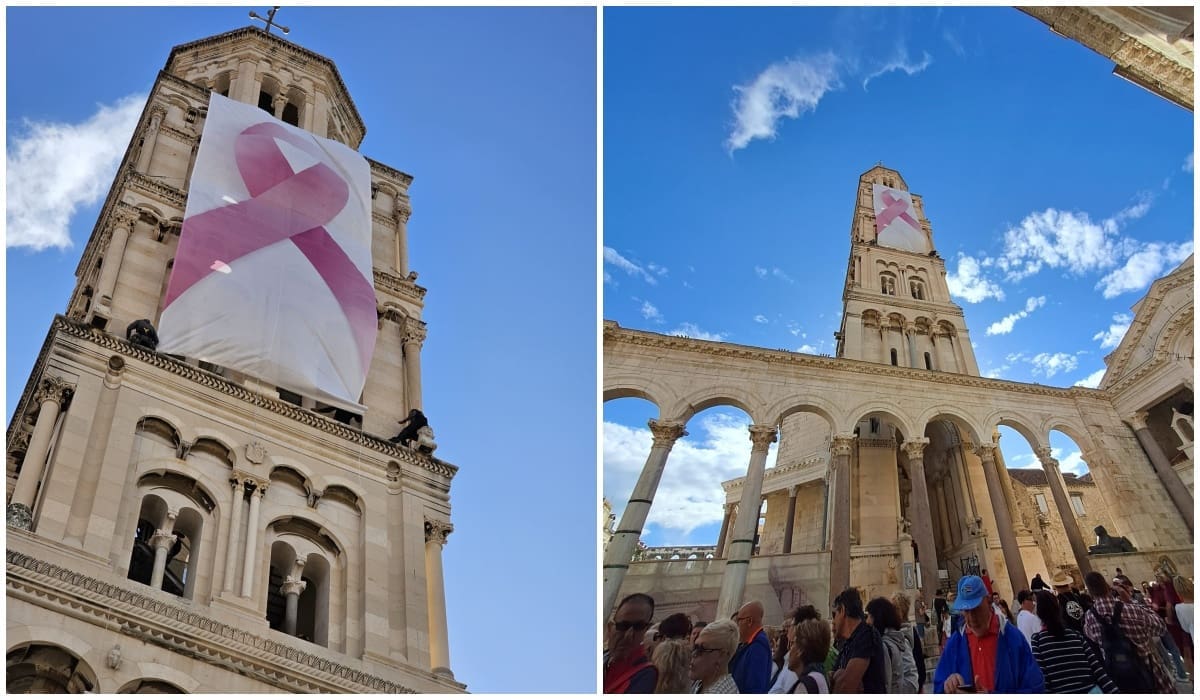 Najveća podrška borbi protiv raka ovog tjedna stiže iz samog srca Splita – s katedrale sv. Duje. S vrha zvonika spušta se impozantna zastava s ružičastom vrpcom, simbolom borbe protiv raka dojke, duga čak 15 metara i široka pet metara.