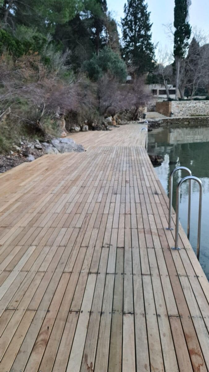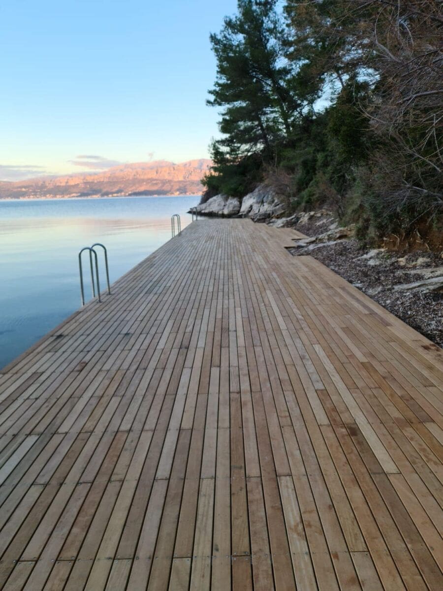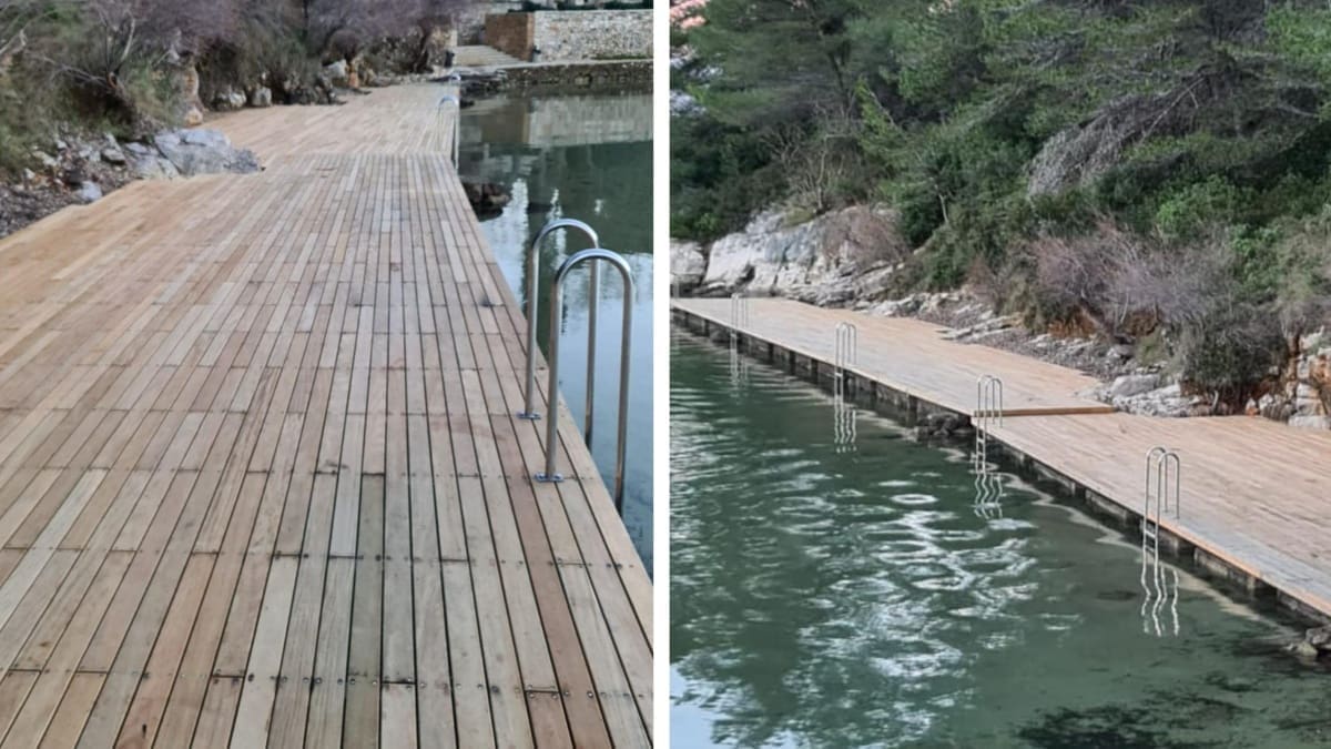 - Više od 350 m² postojećeg betonskog sunčališta natkrilo se izuzetno kvalitetnim deckingom, koji se postavio na konstrukciju od inoksa. Postavljene su i stepenice za lakši ulaz kupačima u more te rampa za ulaz u more osobama s invaliditetom, a koja se sada privremeno uskladištila, do početka ljeta.