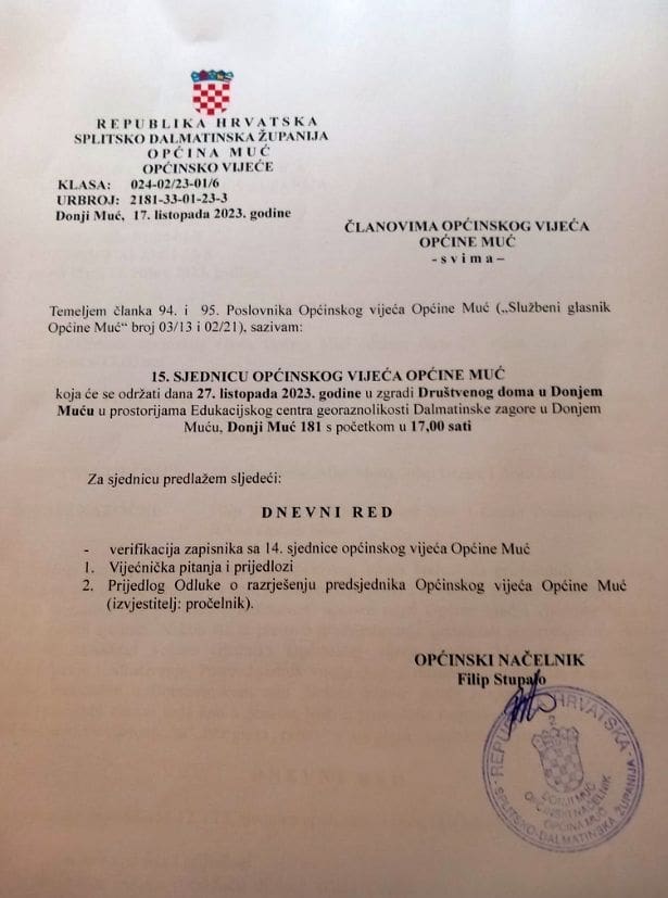 Prije druge točke, one s nazivom Prijedlog Odluke o razrješenju predsjednika Općinskog vijeća Općine Muć, nije se stiglo. Sjednica Vijeća ostala je bez kvoruma jer ju je napustio nezavisni Miro Moro s liste Domovinskog pokreta. Za razrješenje je potrebno imati ruke većine svih vijećnika, sedam od njih trinaest.