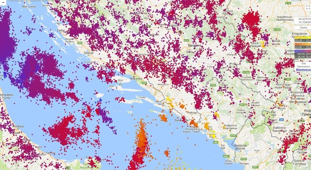 Prema podacima Blitzortunga, njemačkog sustava za detektiranja električnih pražnjenja iz oblaka, tijekom utorka navečer, svakog sata je nad Europom od 10 do 15 tisuća udara munja. Od 23 sata do 1 sat iza ponoći iznad Hrvatske i regije detektirano je 2205 udara munja.