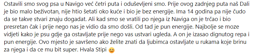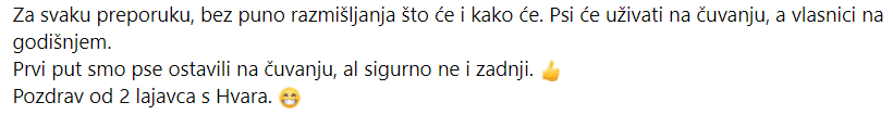 „S obzirom na to da smo u relativno kratkom razdoblju postigli naš cilj, a to je pružiti iznimnu kvalitetu što potvrđuju naših 200 recenzija ukupne ocjene 5.0 te stvoriti nešto što za što su naši brojni gosti iz Italije, Švicarske, Skandinavije, Njemačke i drugih zemalja potvrdili da ovakav smještaj za pse kod njih ne postoji planovi za budućnost su jednostavno održati nivo kvalitete“, kazao je za kraj našeg razgovora vlasnik hotela.