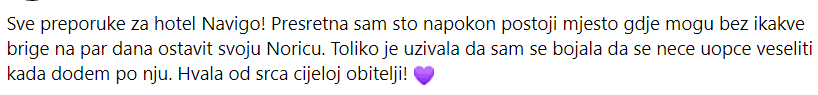 Razdvajanje psa i vlasnika za neke je posebno teško, ali ako je to neizbježno, nema sumnje da je vlastitog ljubimca najbolje ostaviti u rukama profesionalaca. A profesionalci se nalaze u hotelu 'Navigo' gdje psima obitelj Jukić osim smještaja, šetnji, kupanja, zabave... nudi im i puno ljubavi.