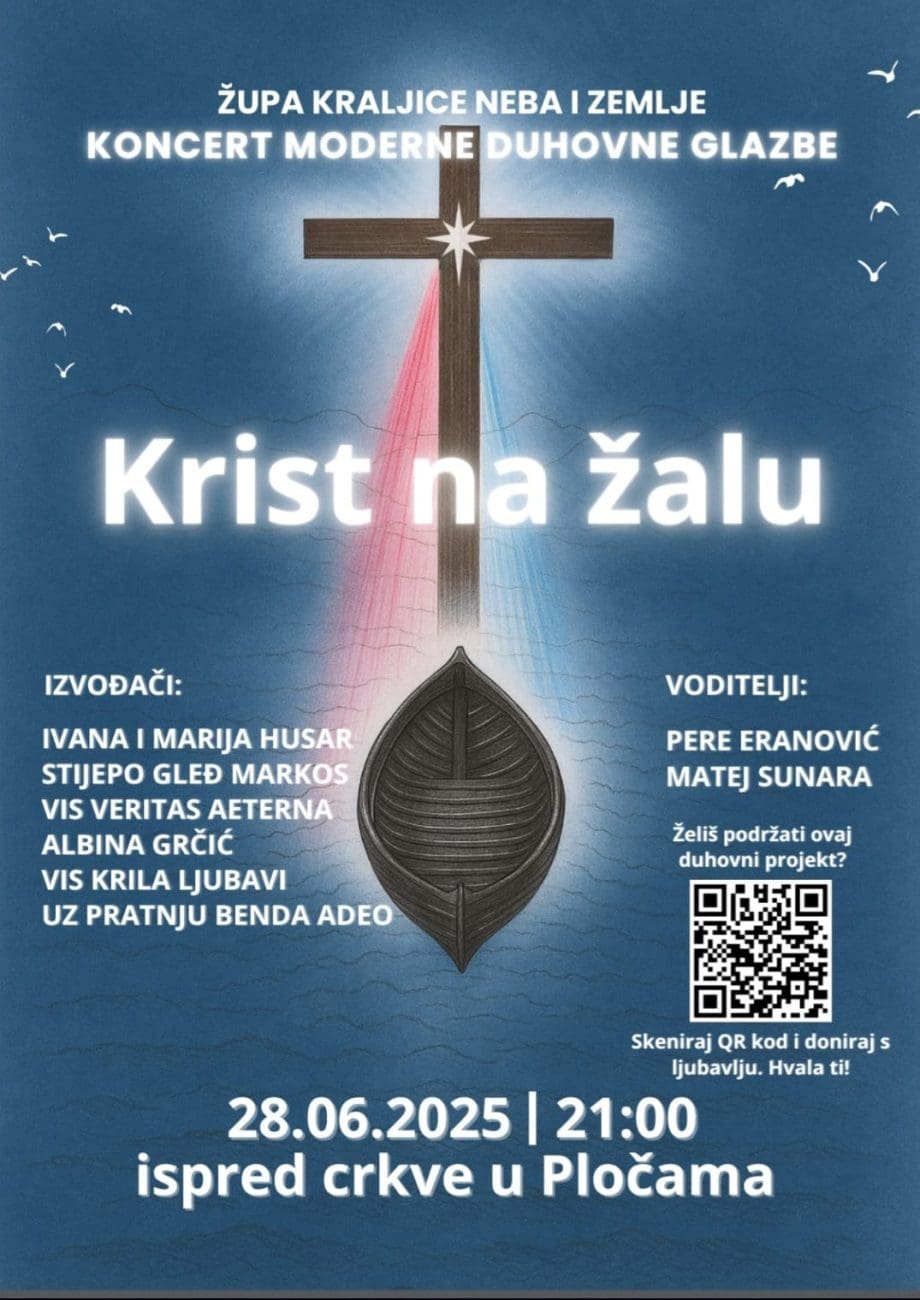 Župa Kraljice Neba i Zemlje organizira koncert moderne duhovne glazbe pod nazivom "Krist na žalu", koji će se održati 28. lipnja 2025. godine s početkom u 21:00 sat ispred crkve u Pločama.